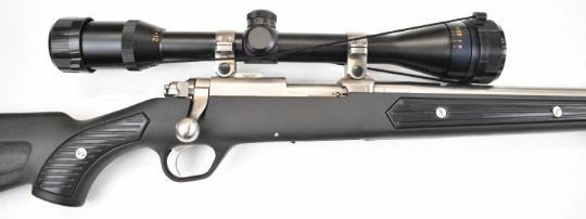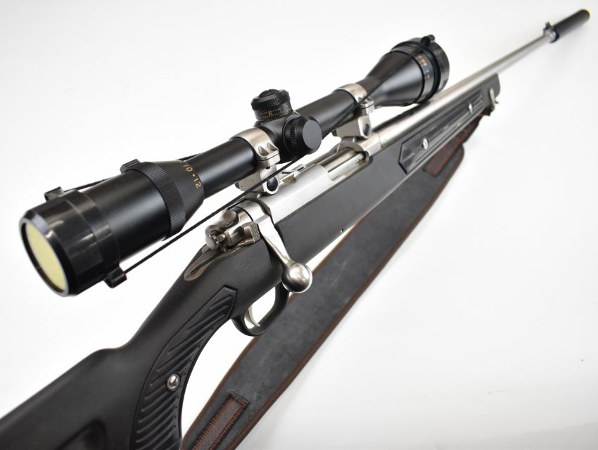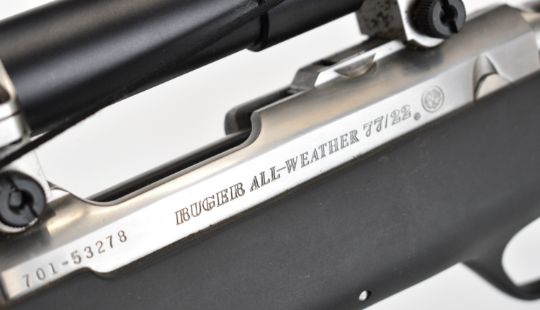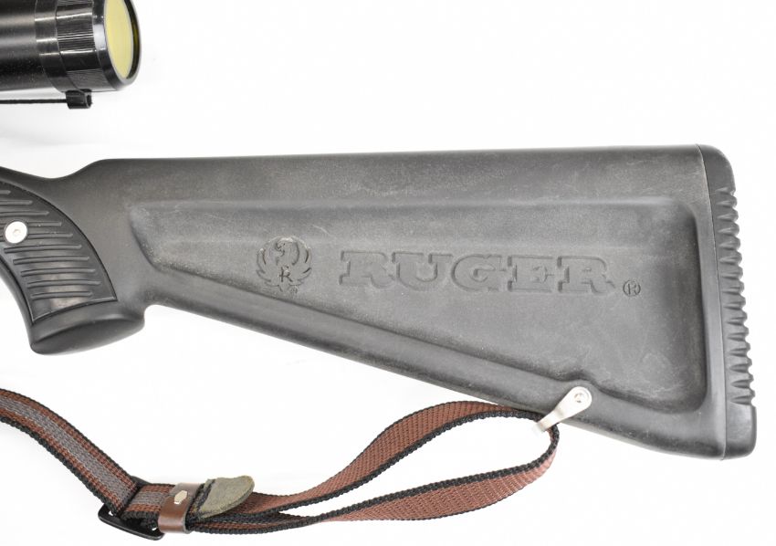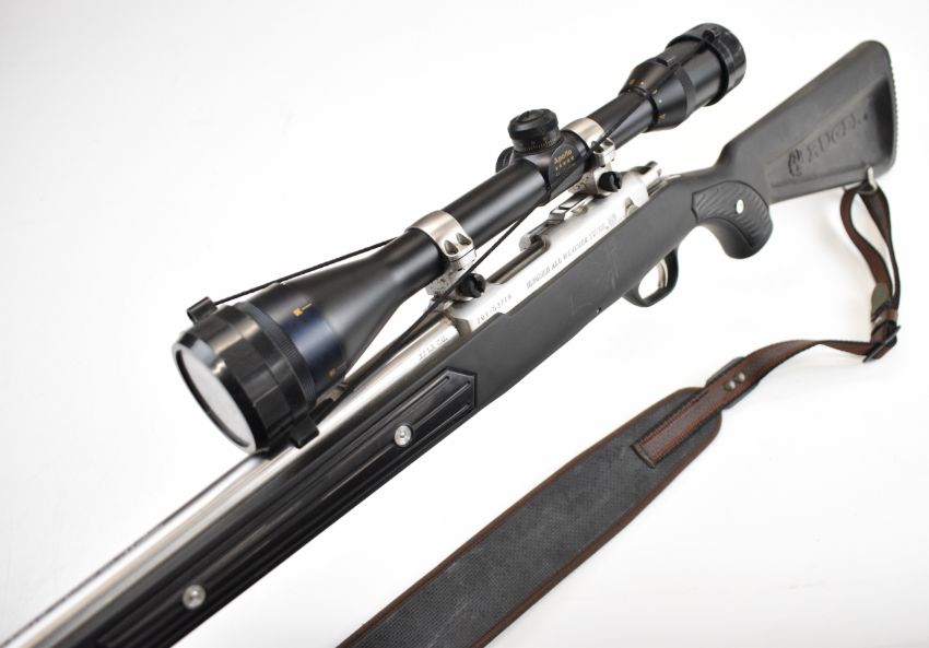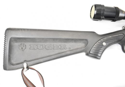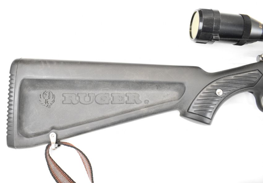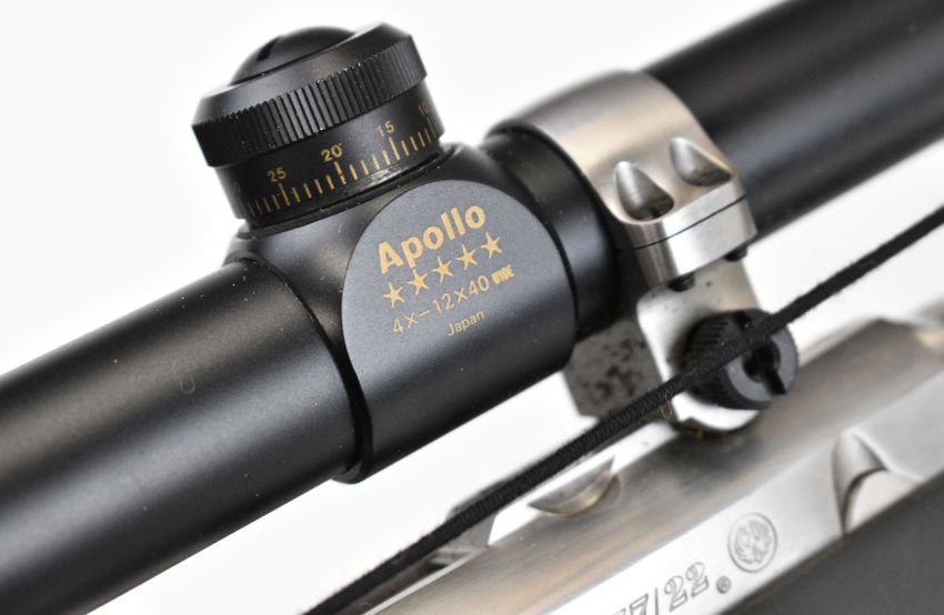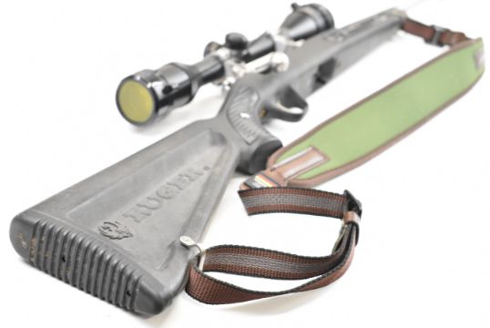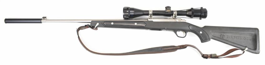 Ruger Model 77/22 .22 bolt-action rifle with named composite stock, Niggeloh neporene sling, Apollo 4-12x40 scope, sound moderator and 27 inch barrel, overall length 117.5cm, serial number 701-53278. PLEASE NOTE THAT A VALID RELEVANT FIREARMS CERTIFICATE IS REQUIRED TO VIEW OR PURCHASE THIS LOT AND FOR ALL SHOTGUNS OR RIFLES PLEASE ENSURE YOU HAVE THE RELEVANT CERTIFICATE BEFORE BIDDING.
