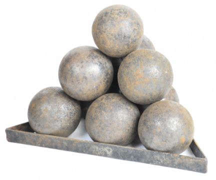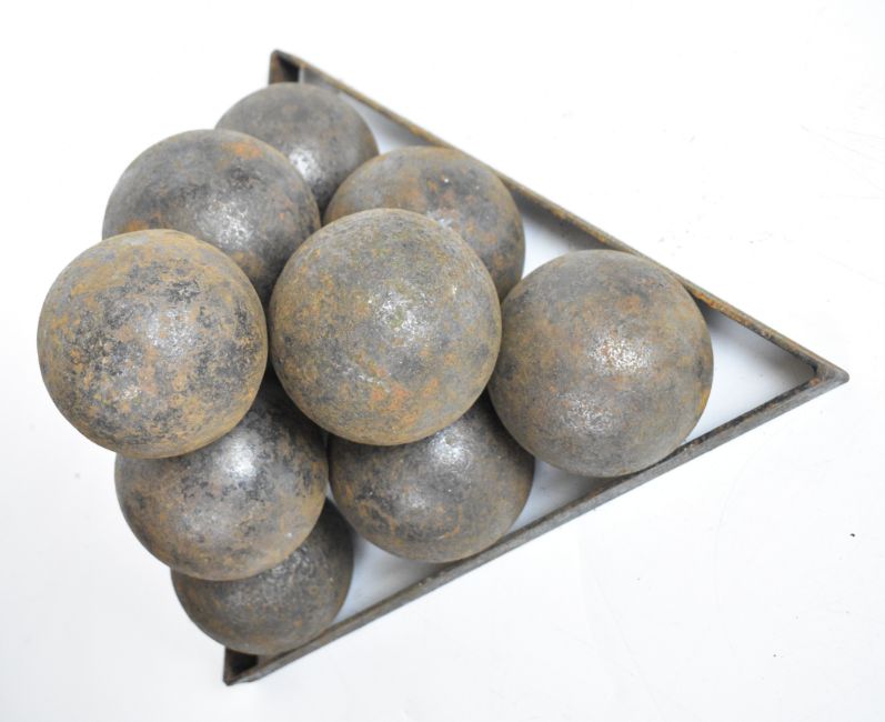 Ten cast iron cannon balls each approximately, 10cm in diameter, on an iron monkey.