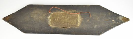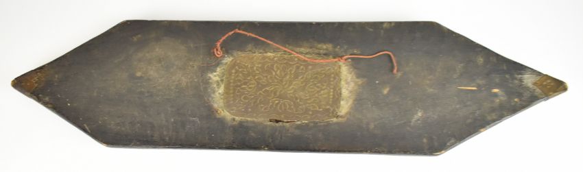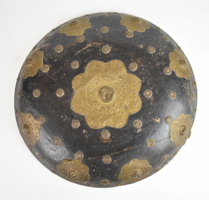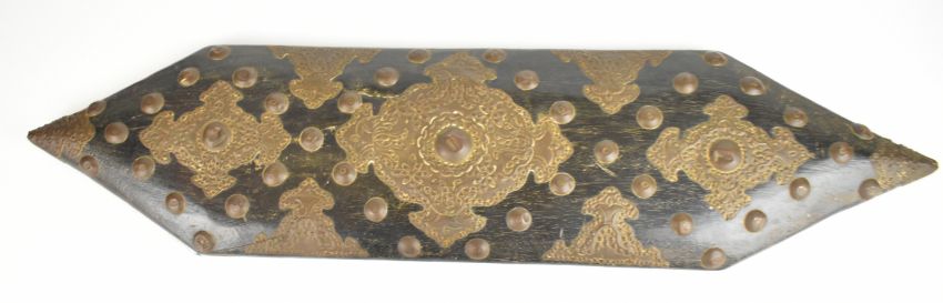 Indian ebonised hardwood shield with brass decoration, H84, together with a circular example