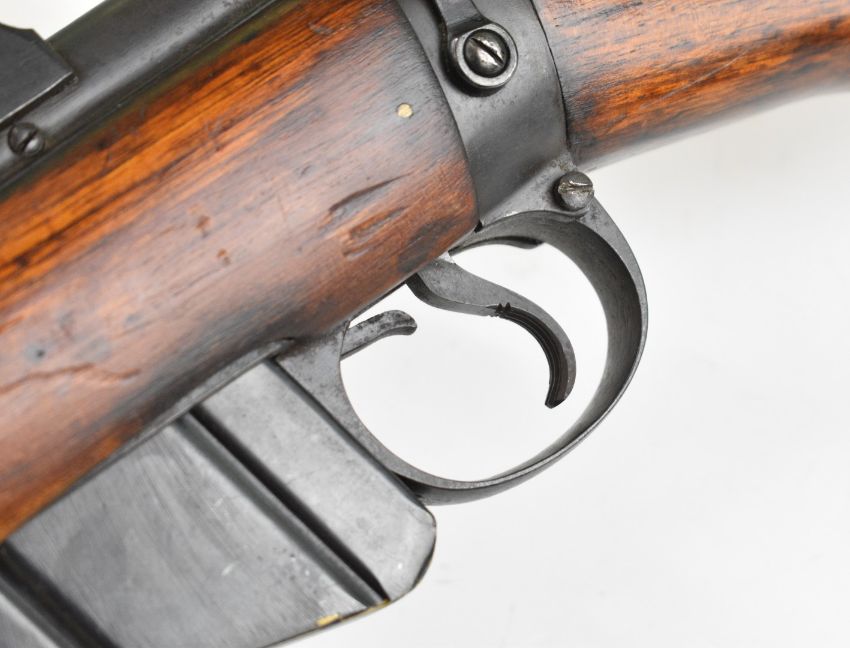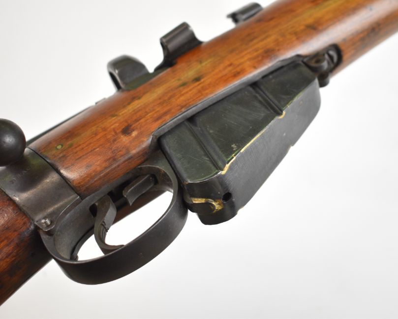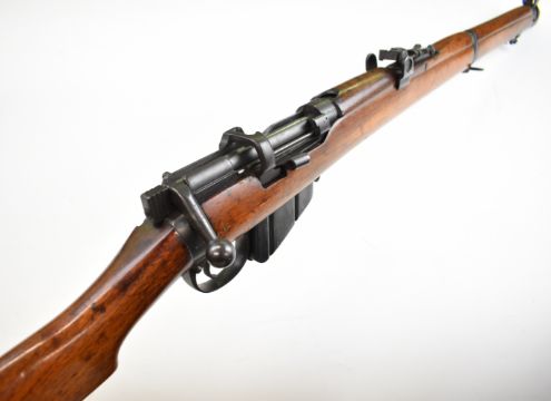 BSA Short Magazine Lee Enfield (SMLE) .303 bolt-action service rifle with frame stamped 'BSA Co', adjustable sights, storage compartment to the brass butt plate, brass plaque inset to the stock, sling mounts, multi-shot magazine and 25 inch barrel, overall length 112cm, serial number 38945. PLEASE NOTE THAT A VALID RELEVANT FIREARMS CERTIFICATE IS REQUIRED TO VIEW OR PURCHASE THIS LOT AND FOR ALL SHOTGUNS OR RIFLES PLEASE ENSURE YOU HAVE THE RELEVANT CERTIFICATE BEFORE BIDDING.