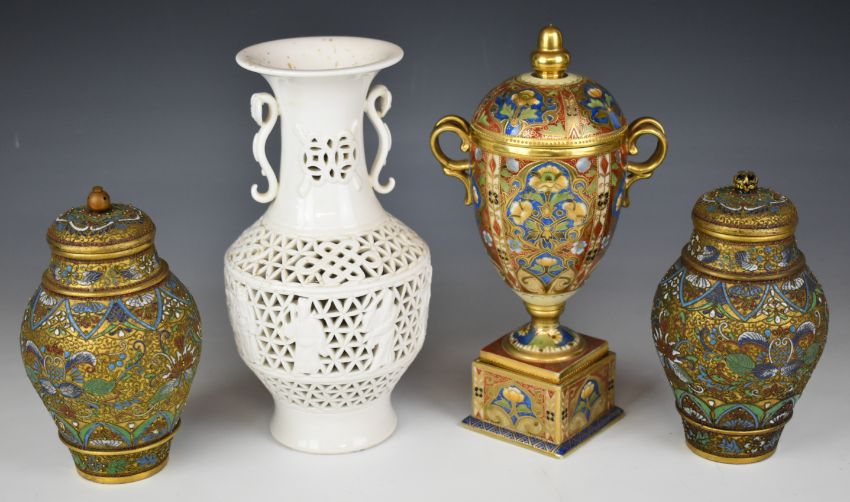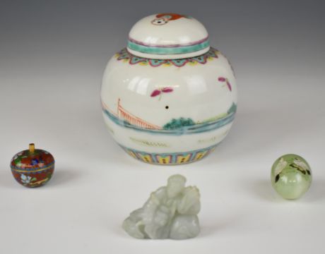 Pair of Chinese cloisonné covered vases, ginger jar, jade figure, Japanese covered urn etc, tallest 26cm
