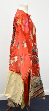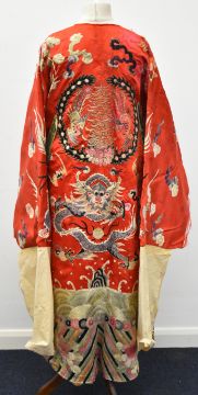 19th/20th Chinese red silk robe embroidered with a four clawed dragon, W168 x L135cm