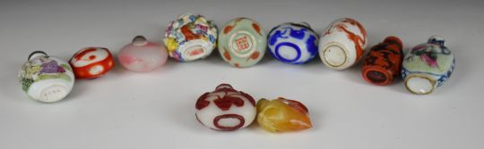 Ten Chinese porcelain / glass snuff bottles, tallest 8cm