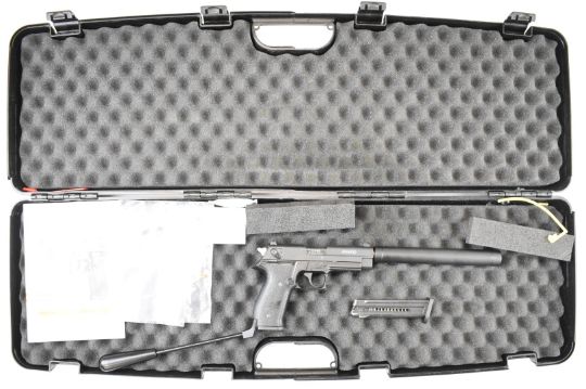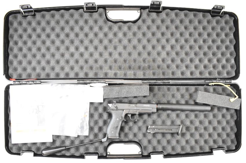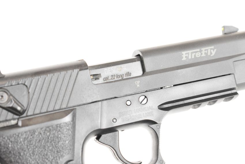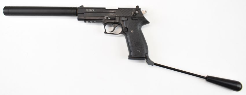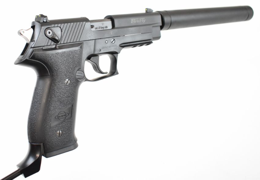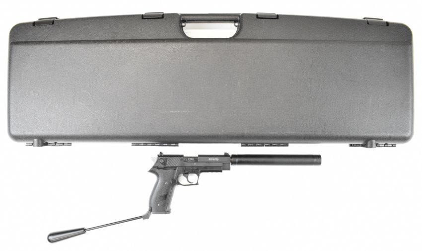 German Sport Guns (GSG) Fire Fly .22LR semi-automatic long barreled pistol with textured composite grips, barrel shroud, fixed sights, two multi-shot magazines and 10.5 inch barrel, overall length 63.5cm, serial number F432147, in original padded carry case with instruction manual and accessories. PLEASE NOTE THAT A VALID RELEVANT FIREARMS CERTIFICATE IS REQUIRED TO VIEW OR PURCHASE THIS LOT AND FOR ALL SHOTGUNS OR RIFLES PLEASE ENSURE YOU HAVE THE RELEVANT CERTIFICATE BEFORE BIDDING.