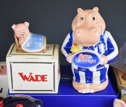Nineteen Wade Nat West pig money boxes including Cousin Wesley, two sets of Piggy Press magazines 1-15, statement folder with accessories, jigsaw, three further Nat West boxed pig money boxes, Silentnight hippo, panda etc etc