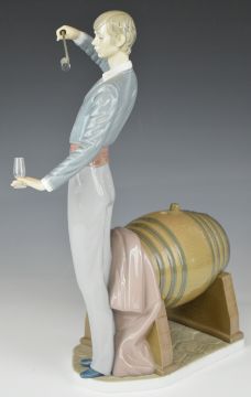 Lladro 'Wine Taster' figure pouring a glass of wine from a barrel, H37cm