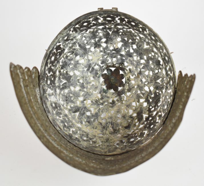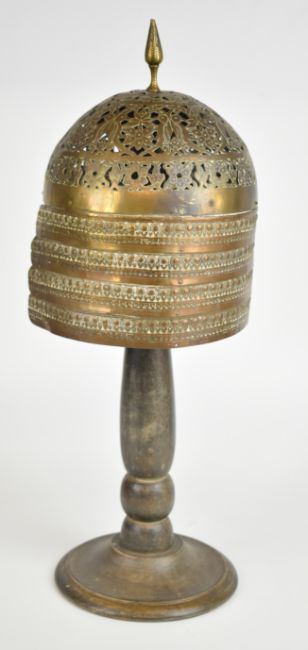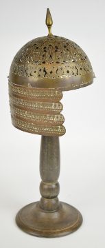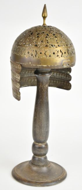 Indian /Persian brass helmet with spike finial, on stand, H25cm