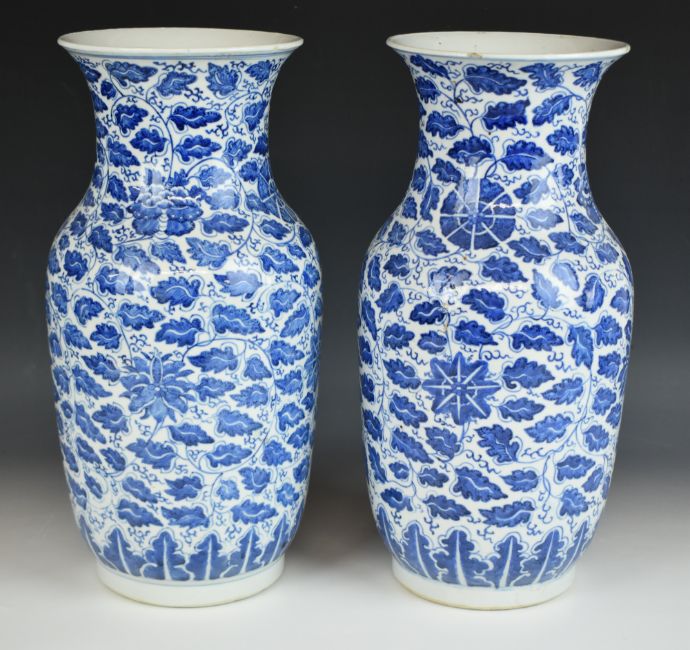 Chinese pair of late 19th/20thC porcelain vases with blue and white foliate decoration and four character mark to base, H35.5cm