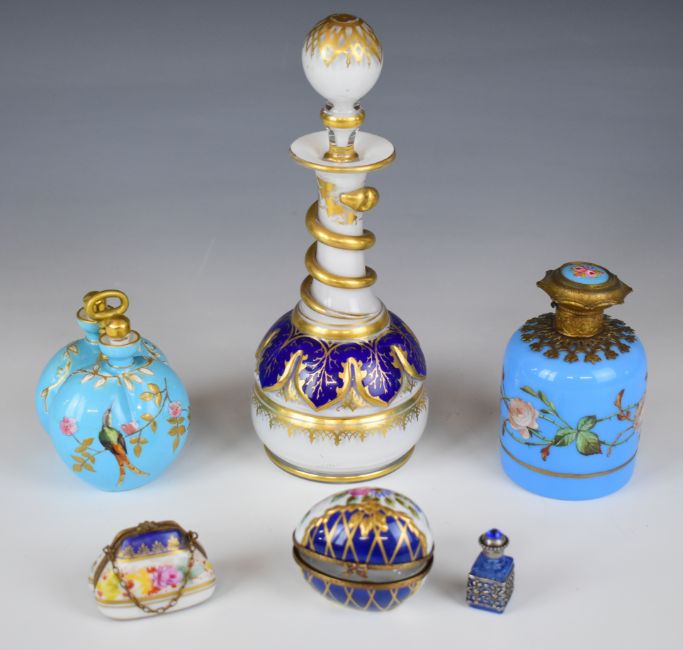 Double gourd scent bottle with stoppers and enamel decoration, large glass bottle with spiral decoration etc, talllest 22cm