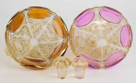 A pair of 19thC French cut glass decanters and stoppers with jewelled decoration and tinted panels, diameter 14 x height 13cm
