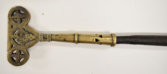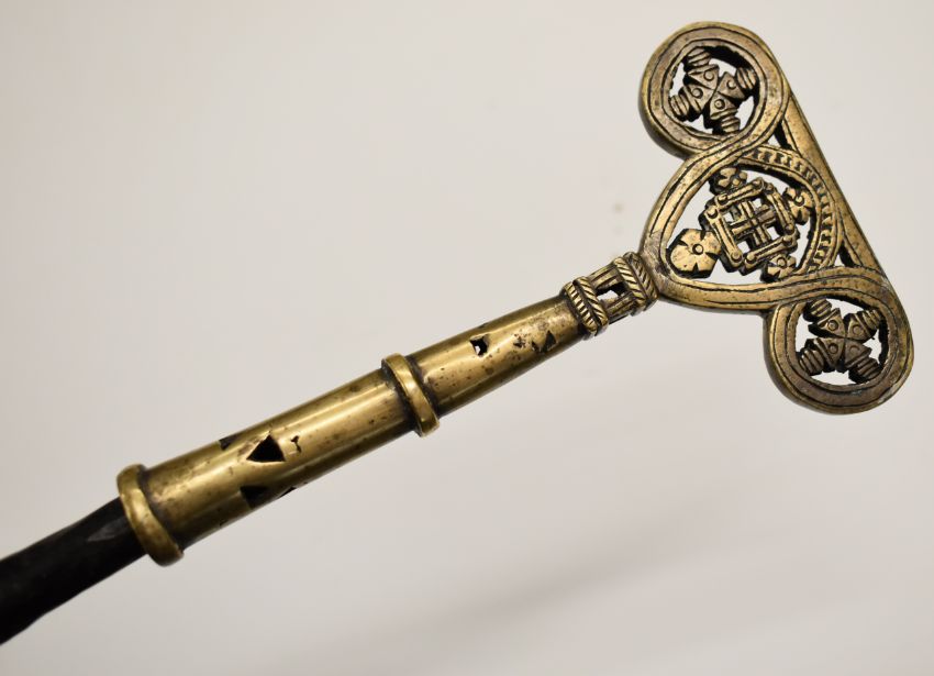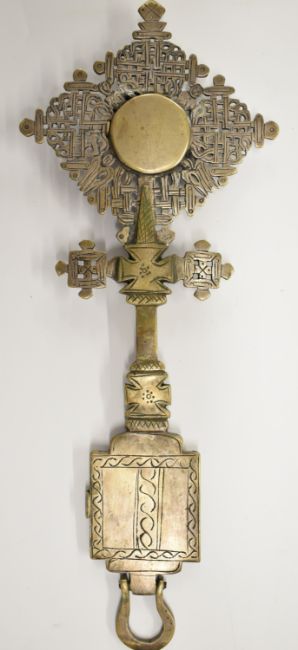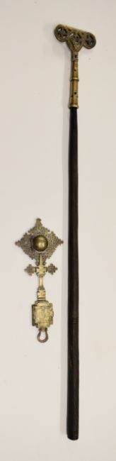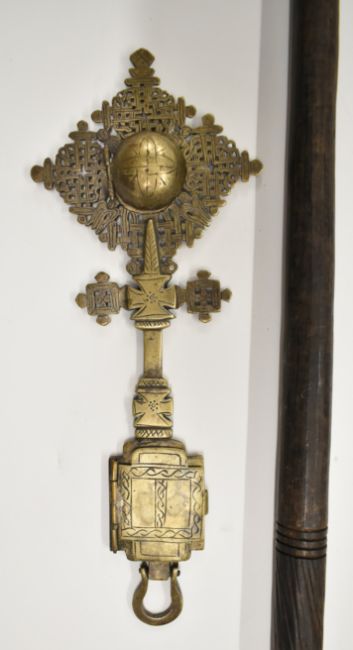 Ethiopian Christian metal cross having two hinged compartments with figural decoration, 27.5cm and a worked metal staff finial, tallest 29cm