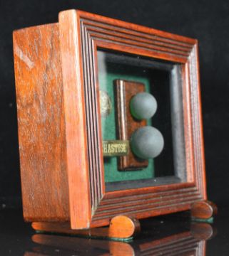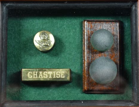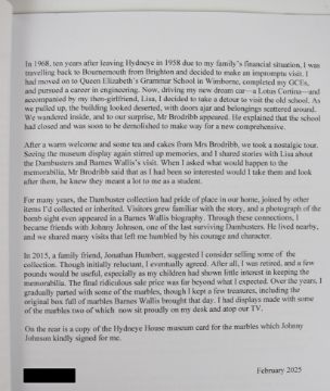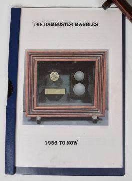 (Dambusters and Barnes Wallis interest). Two antique marbles stated by the vendor that they were used by Barnes Wallis in his early tests, which would be part of the inspiration for the concept of the Bouncing Bomb, larger marble measuring approximately just over 1" diameter, the other smaller marble approximately just under 1", both have a textured frosted form, a brass RAF button and engraved brass plaque with inscription 'Chastise' (Operation Chastise, more commonly known as the Dambusters Raid), all mounted in a later wooden display frame with laminated photocopy of the museum card from Hydneye House School museum stating that "These marbles were used by Barnes Wallis in his original experiments at White Hill House, Effingham in 1942, kindly donated by Barnes Wallis" with signature of George Leonard 'Johnny' Johnson MBE DFM, verso, total frame size 19cm x 16cm, sold together with small information folder written by the vendor giving his history surrounding the items and how he came upon them, with photos of him at the school and when he returned in 1968.