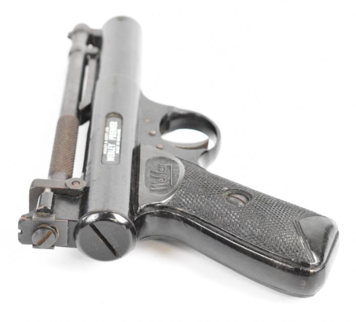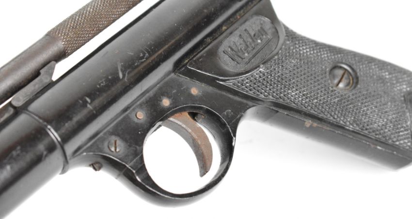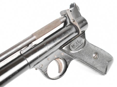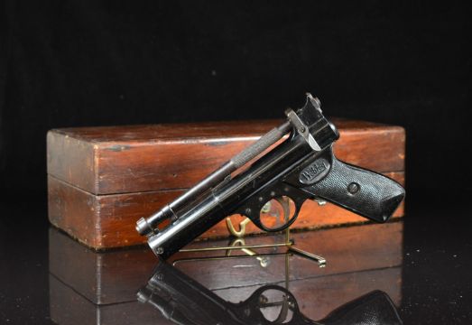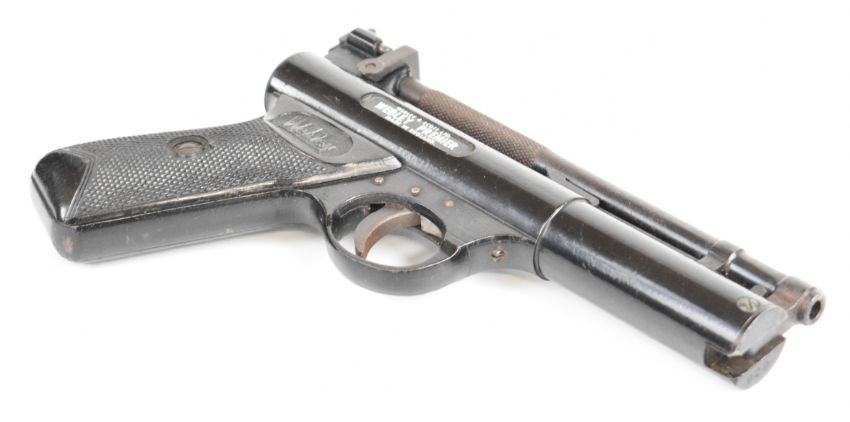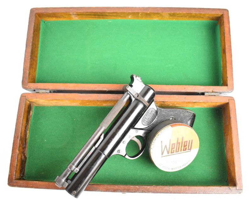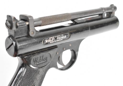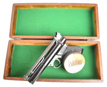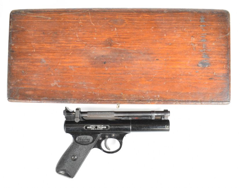 Webley Premier .22 air pistol with named and chequered grips and adjustable sights, serial number 920, in wooden box with Webley Special Waisted Pellets tin. PLEASE NOTE: ALL POST - 1939 AIR GUNS CAN ONLY BE SHIPPED TO AN RFD AND NOT TO A HOME ADDRESS.
