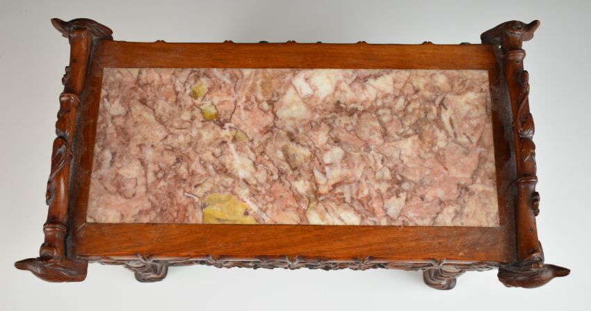 19th/20thC Chinese marble inset twin handled carved oblong jardiniere stand with decoration of flora and fauna, W44 x D23 x H20cm