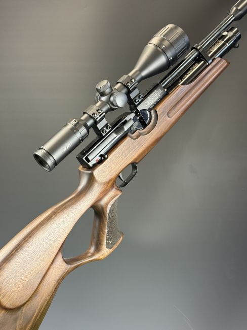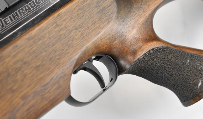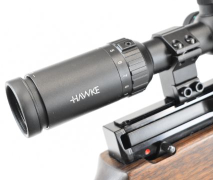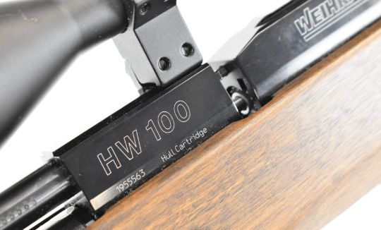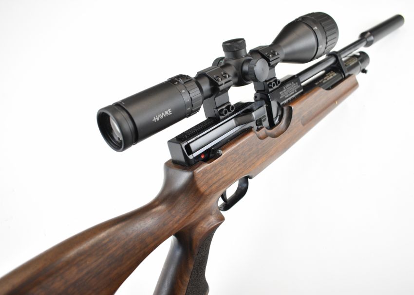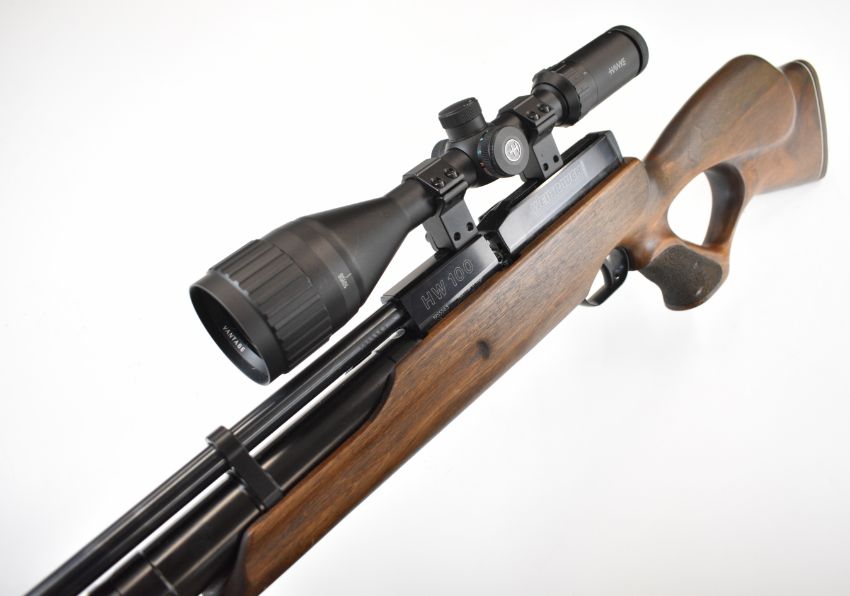 Weihrauch HW100 .177 PCP air rifle with chequered thumb-hole grip and forend, raised cheek piece, adjustable trigger, sound moderator and Hawke Vantage 3-9x50 AO Mil Dot scope, serial number 1955563.