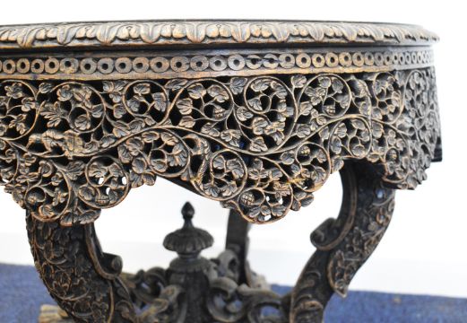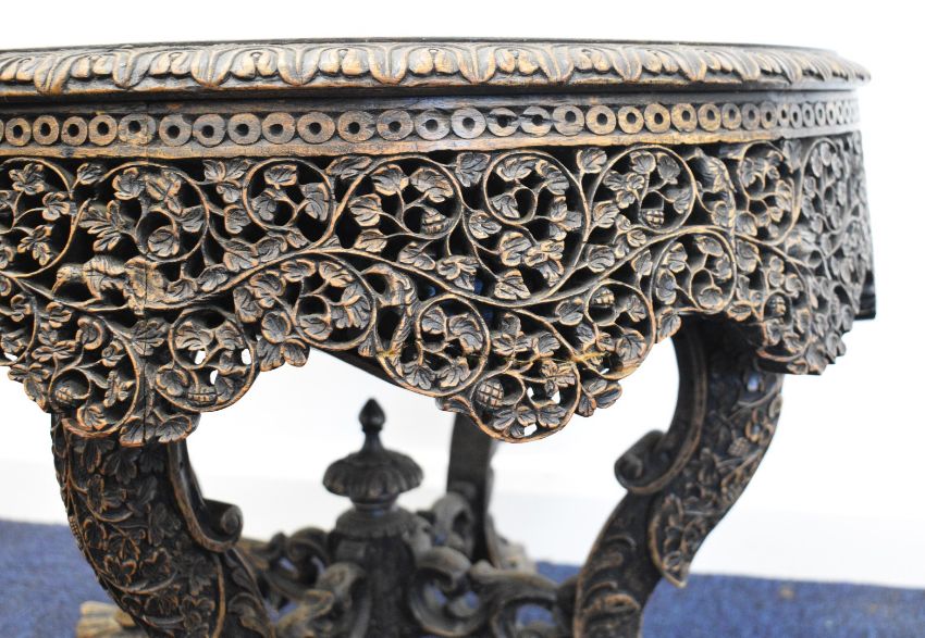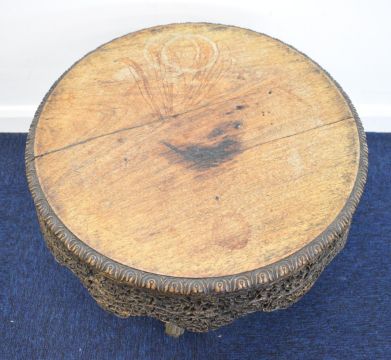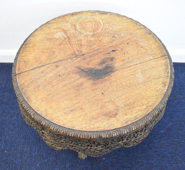 19thC Anglo Indian carved hardwood circular low table with shaped apron, raised on figural animal head legs, diameter 59 x H47cm