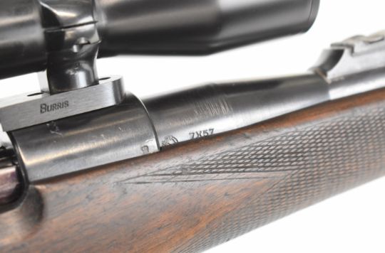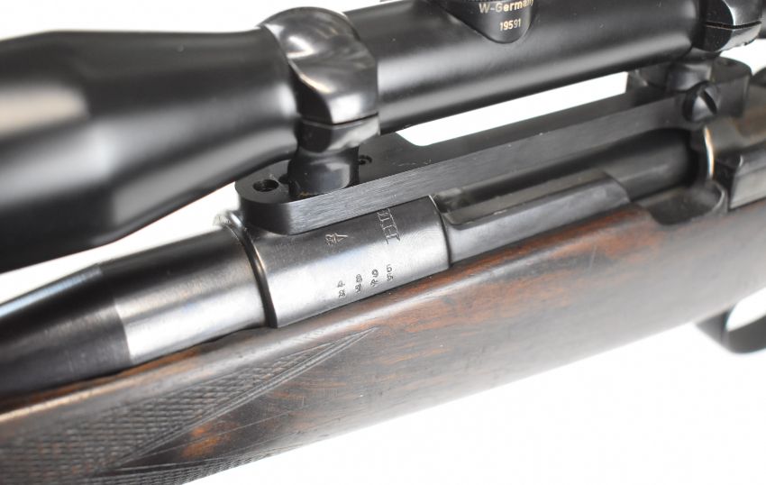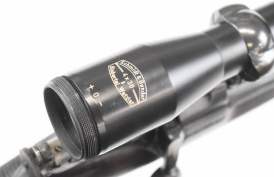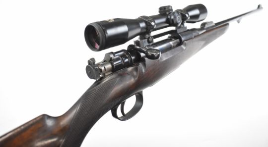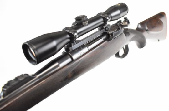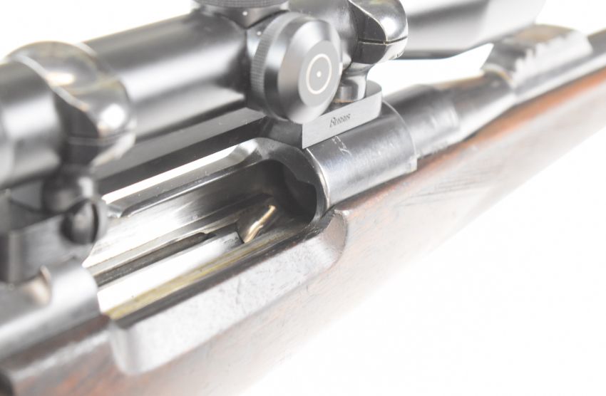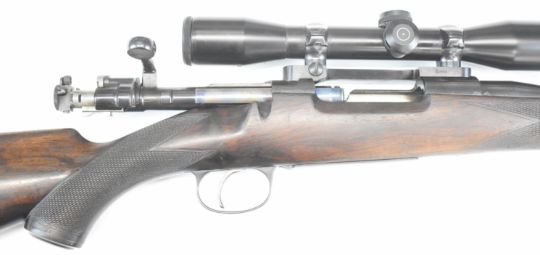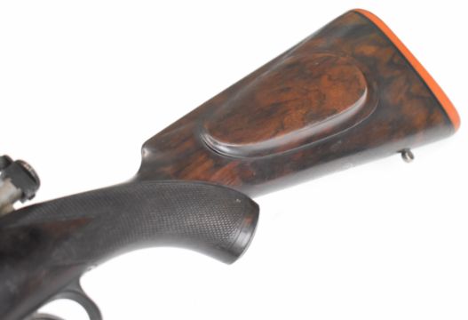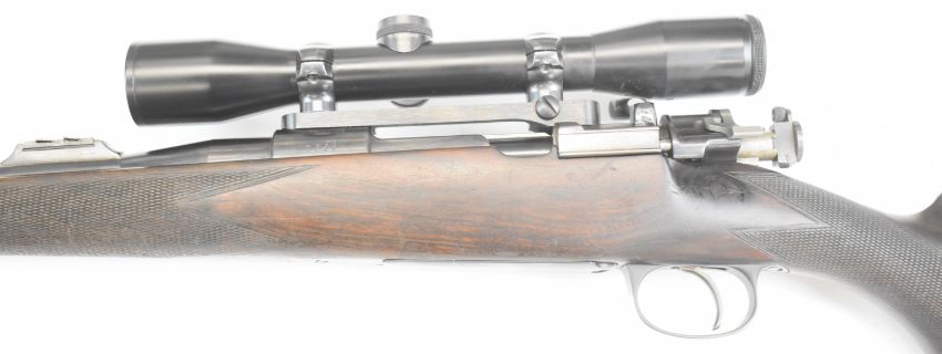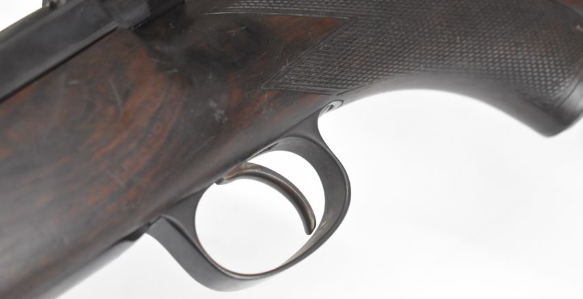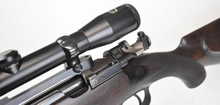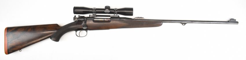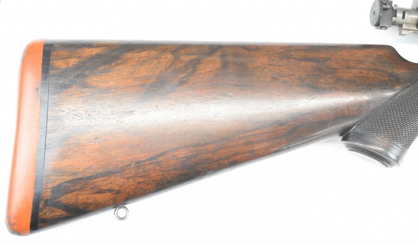 John Rigby & Co .275 bolt-action sporting rifle with chequered and horn tipped semi-pistol grip, folding leaf sights, sling mounts, raised cheek-piece, engraved silver cartouche to the underside of the stock, Schmidt & Bender 4x56 scope and 25 inch barrel engraved 'John Rigby & Co 13 Pall Mall London SW1', overall length 115cm, serial number 4895. PLEASE NOTE THAT A VALID RELEVANT FIREARMS CERTIFICATE IS REQUIRED TO VIEW OR PURCHASE THIS LOT AND FOR ALL SHOTGUNS OR RIFLES PLEASE ENSURE YOU HAVE THE RELEVANT CERTIFICATE BEFORE BIDDING
