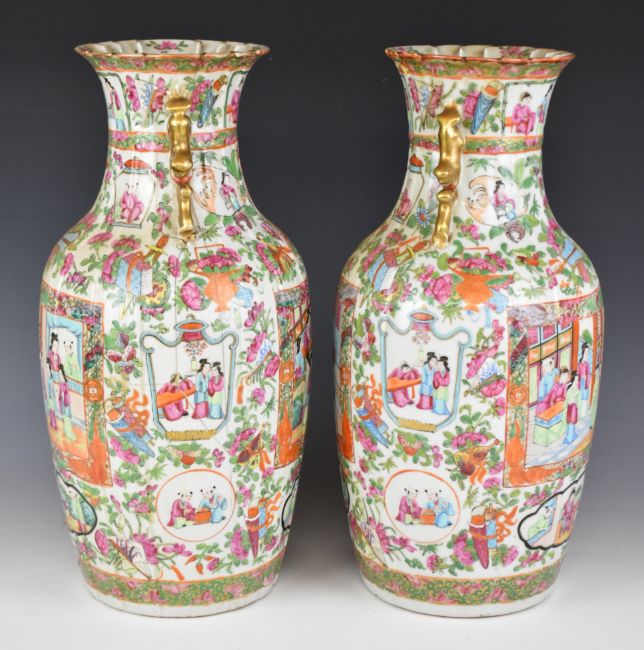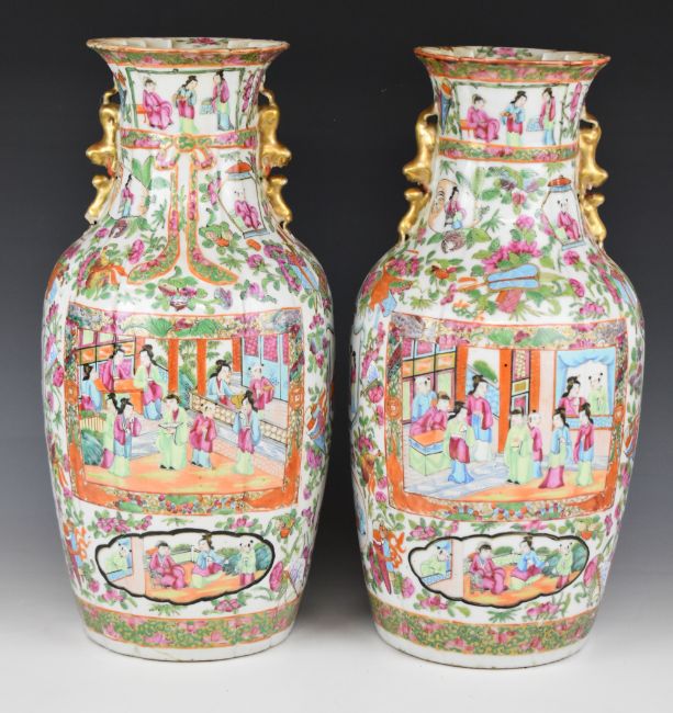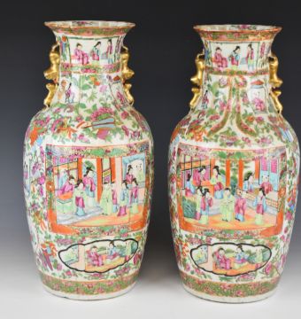 Pair of 19thC Chinese famille rose vases decorated with court scenes, H45cm