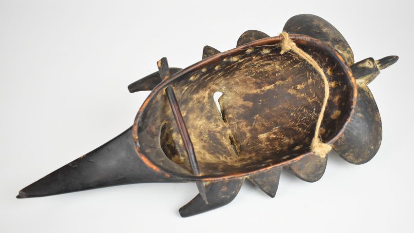 19thC African tribal Ghana carved wood bird face mask with open beak, H43cm