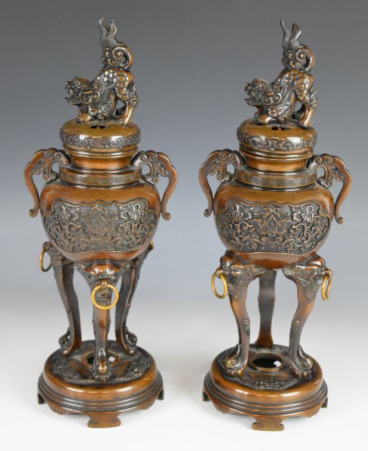 Pair of Chinese bronze covered censers with Dog of Fo finials, H33cm