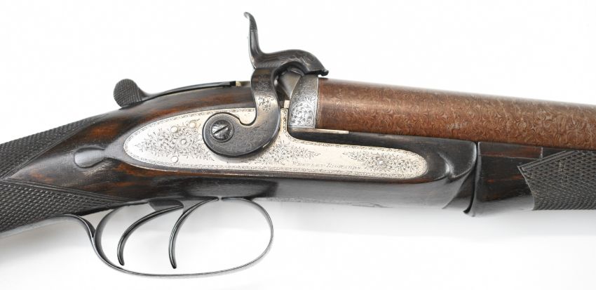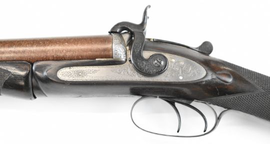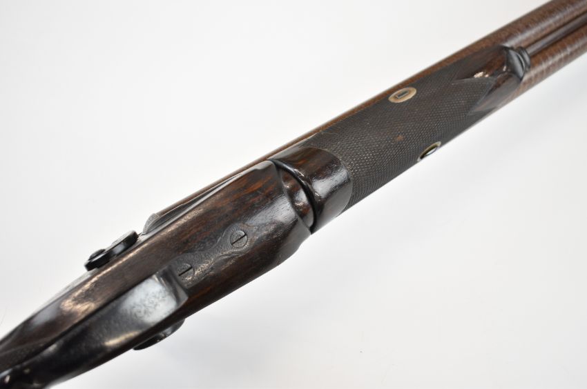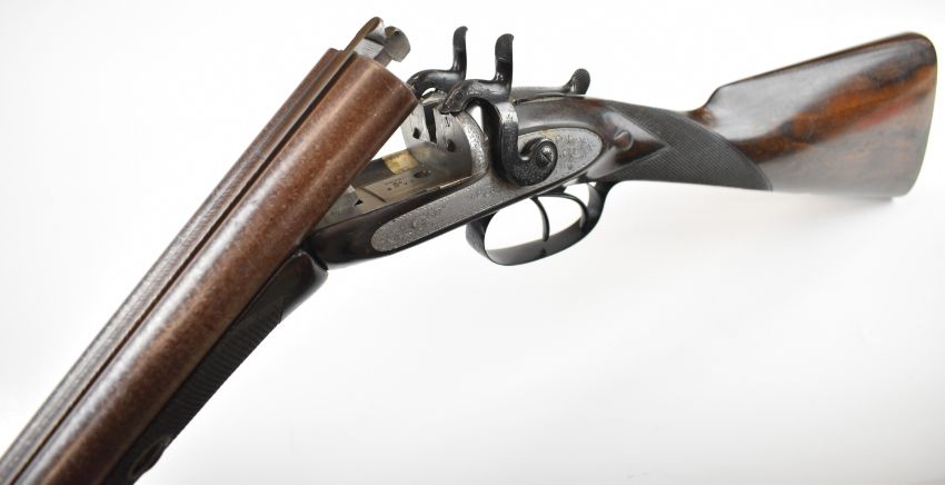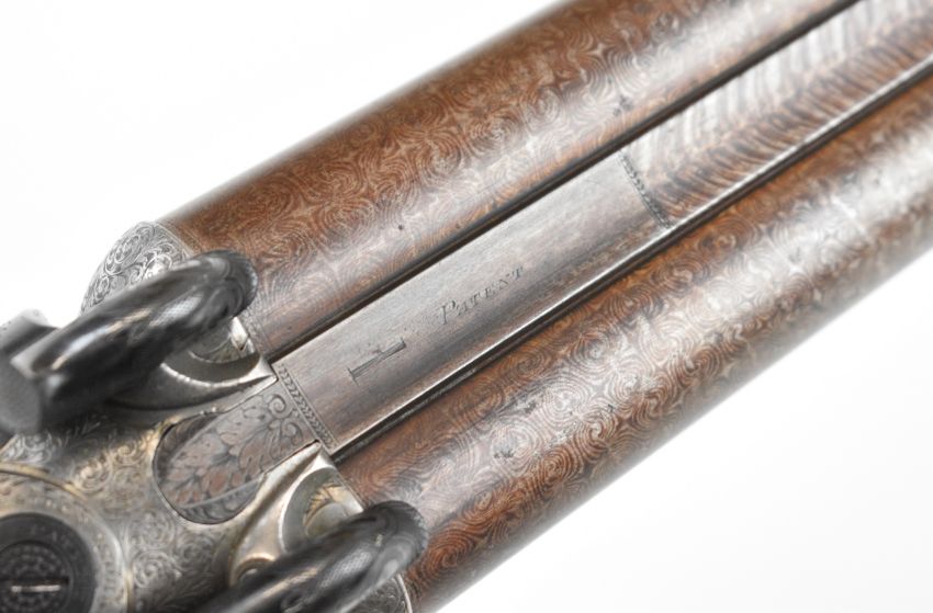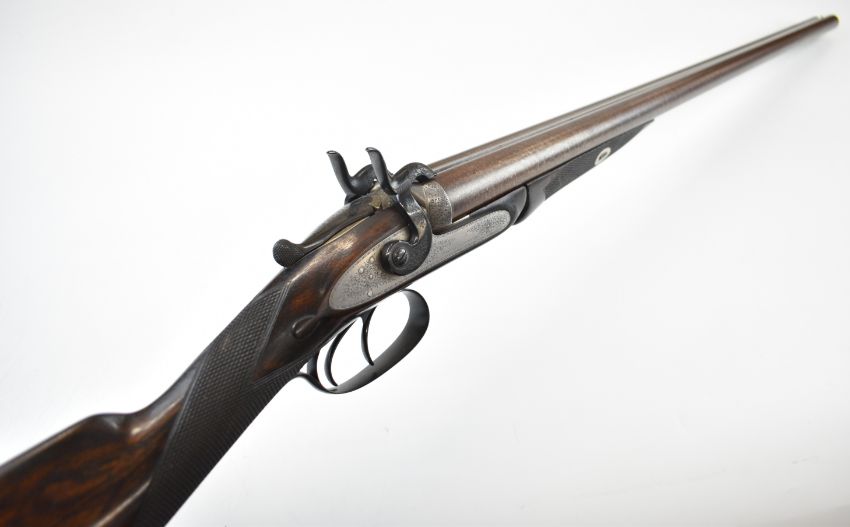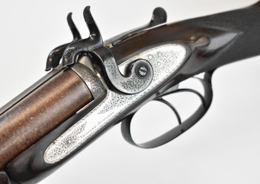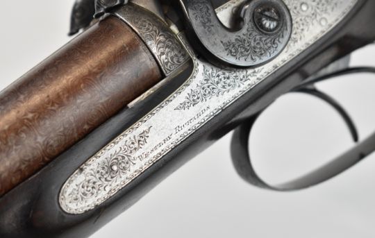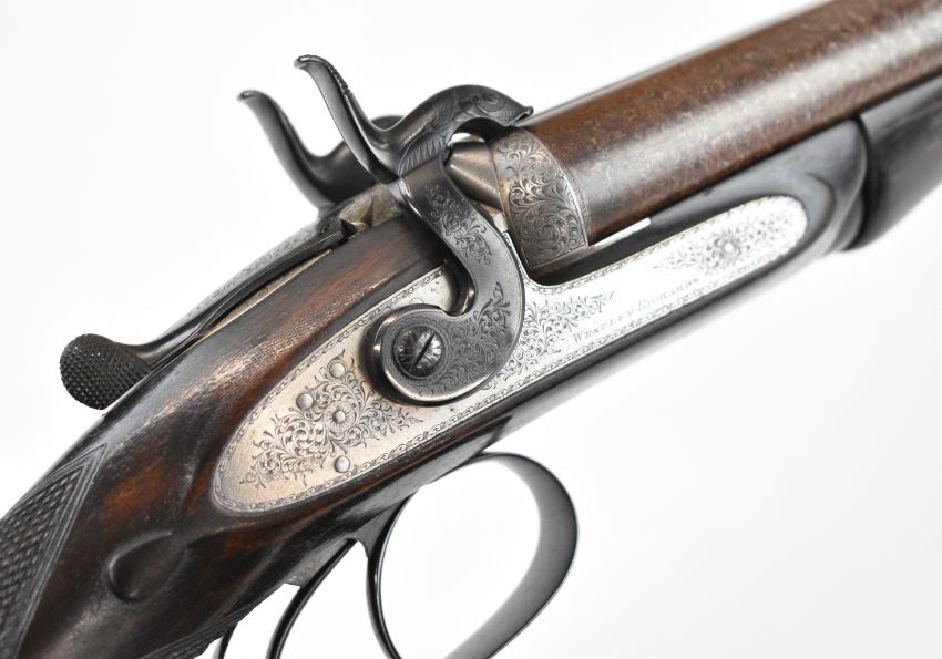 Westley Richards 12 bore bar-in-wood side by side centre fire converted from pinfire hammer action shotgun with named and engraved locks and thumb lever, engraved hammers, trigger guard, top plate and fences, chequered grip and horn tipped forend, carved teardrop to the wrist, vacant cartouche to the underside of the stock, double trigger and named 30 inch Damascus barrels choked cylinder, overall length 117.5cm, length of pull 36cm, serial number 12210PLEASE NOTE THAT A VALID RELEVANT SHOTGUN CERTIFICATE IS REQUIRED TO VIEW OR PURCHASE THIS LOT AND FOR ALL SHOTGUNS OR RIFLES. PLEASE ENSURE YOU HAVE THE RELEVANT CERTIFICATE BEFORE BIDDING.