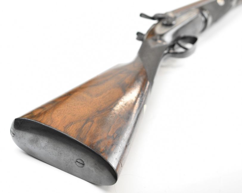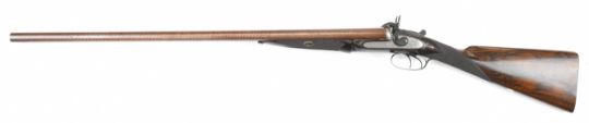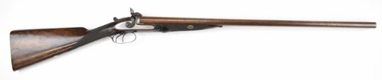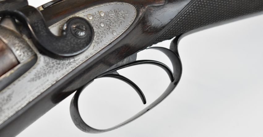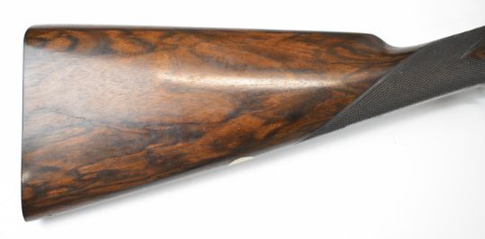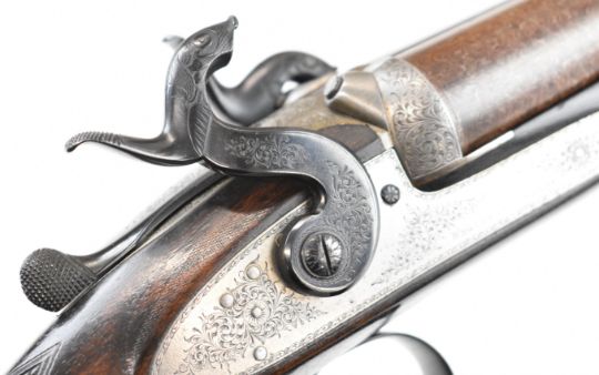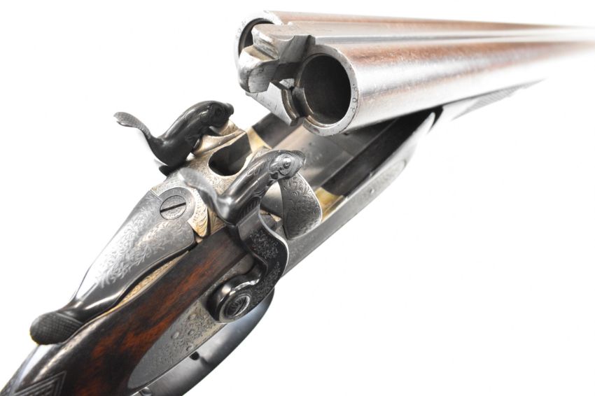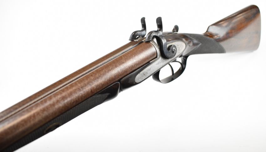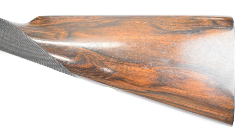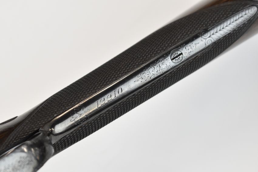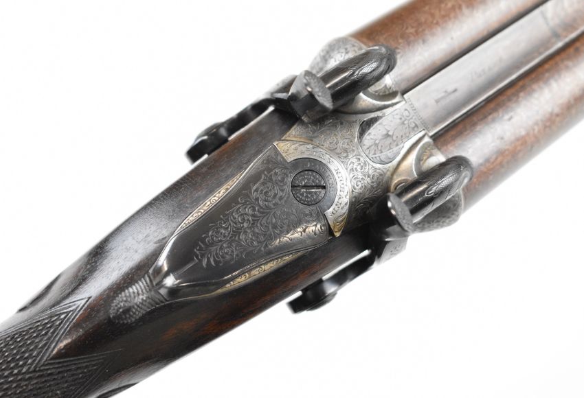 Westley Richards 12 bore bar-in-wood side by side centre fire converted from pinfire hammer action shotgun with named and engraved locks and thumb lever, engraved hammers, trigger guard, top plate and fences, chequered grip and horn tipped forend, carved teardrop to the wrist, vacant cartouche to the underside of the stock, double trigger and named 30 inch Damascus barrels choked cylinder, overall length 117.5cm, length of pull 36cm, serial number 12210PLEASE NOTE THAT A VALID RELEVANT SHOTGUN CERTIFICATE IS REQUIRED TO VIEW OR PURCHASE THIS LOT AND FOR ALL SHOTGUNS OR RIFLES. PLEASE ENSURE YOU HAVE THE RELEVANT CERTIFICATE BEFORE BIDDING.