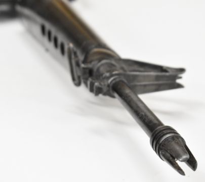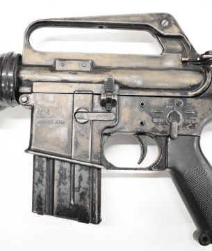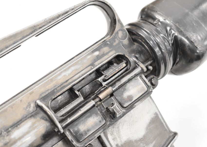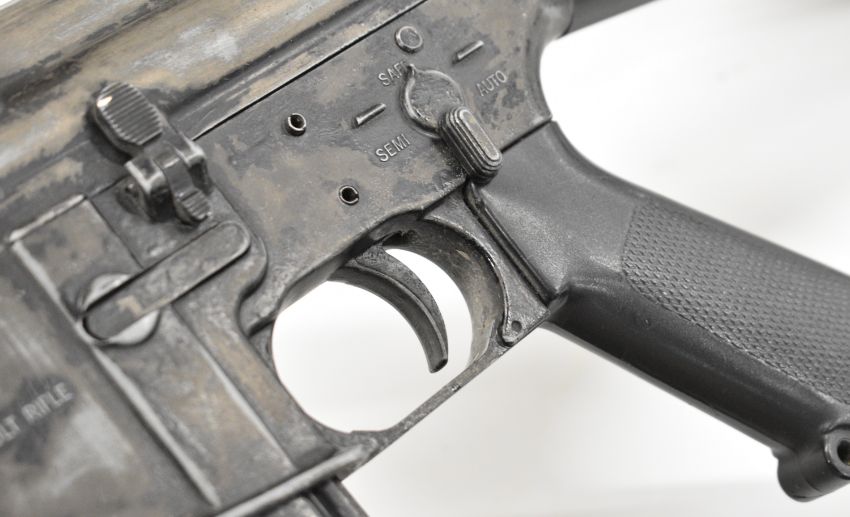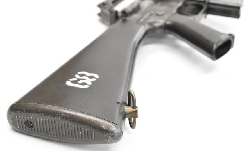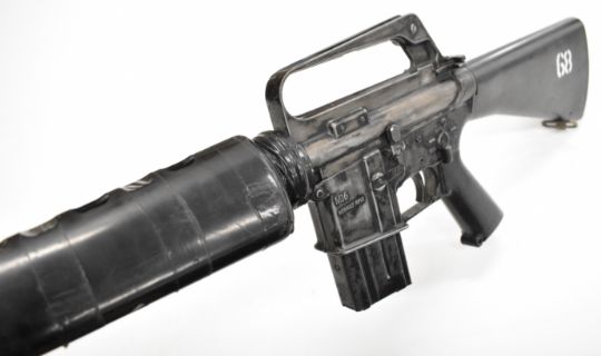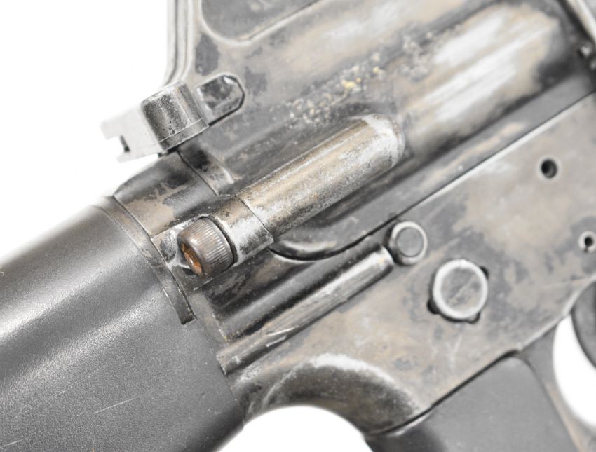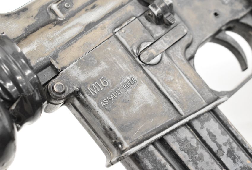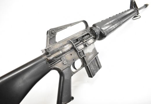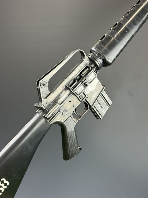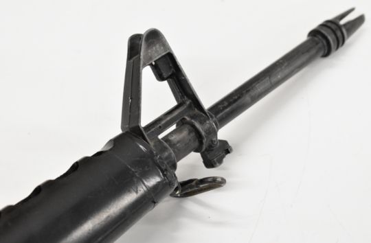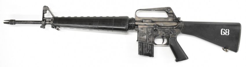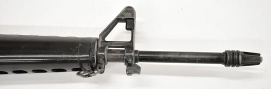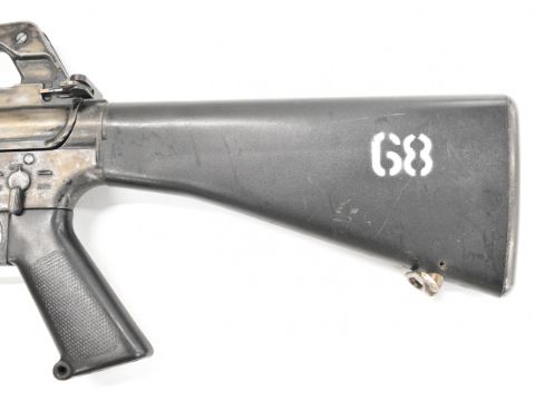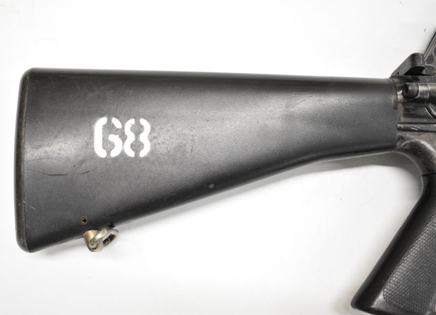 Unnamed 6mm blank plug firing M16 assault style rifle with composite stock pistol grip and forend and sling mounts, NVSN.