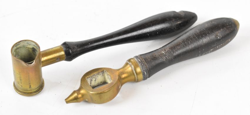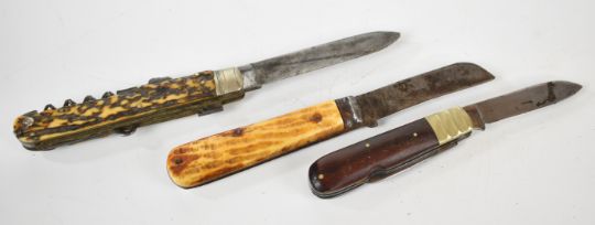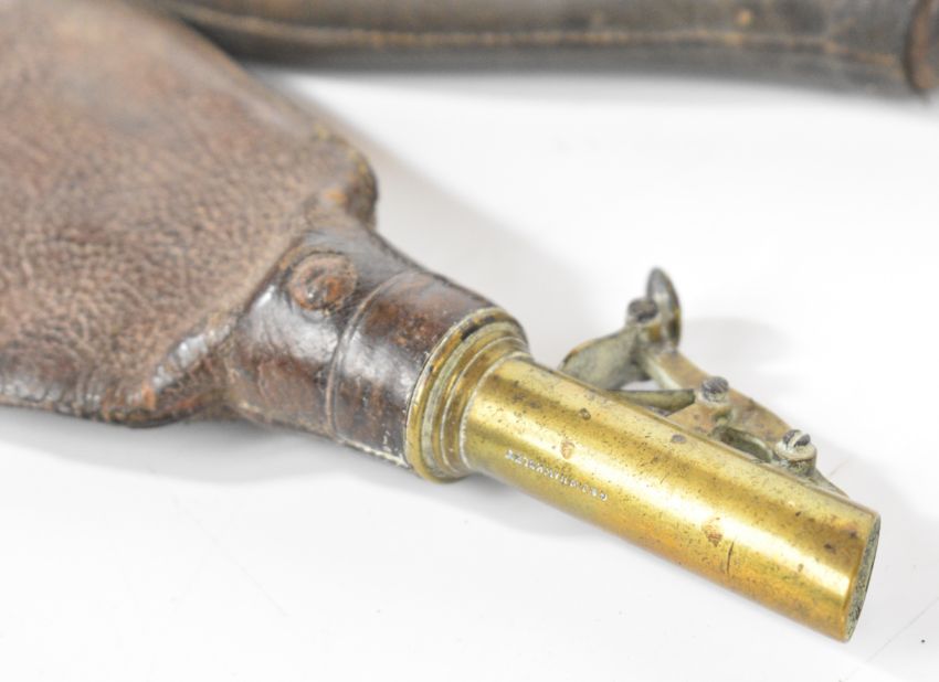 A collection of gun and sporting related items comprising a copper and brass powder flask, two leather shot flasks one by G&JW Hawksley, G&JW Hawksley powder measure, shotgun cartridge re-loading roll-turnover tool, Williams & Co of Cheltenham multi-tool knife with stag antler scales, Lockwood Brothers of Sheffield knife and one other similar knife.