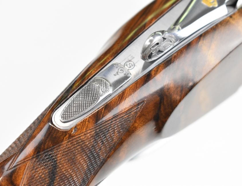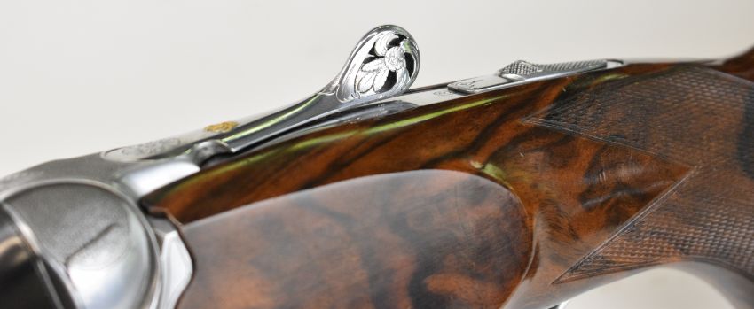 Beretta ASE 90 Trap 12 bore over and under ejector shotgun with gold inlaid naming, chequered semi-pistol grip and forend, vented top and central ribs, detachable trigger plate, single trigger and named 29.5 inch barrels choked ¾ and full, overall length 118cm, length of pull 36.5cm, serial number AD2614B, in fitted faux leather case. PLEASE NOTE THAT A VALID RELEVANT SHOTGUN CERTIFICATE IS REQUIRED TO VIEW OR PURCHASE THIS LOT AND FOR ALL SHOTGUNS OR RIFLES PLEASE ENSURE YOU HAVE THE RELEVANT CERTIFICATE BEFORE BIDDING
