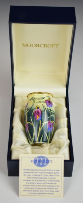 Moorcroft enamels vase decorated with snakeshead fritillary flowers and signed by Phillip Gibson, H6.3cm, boxed