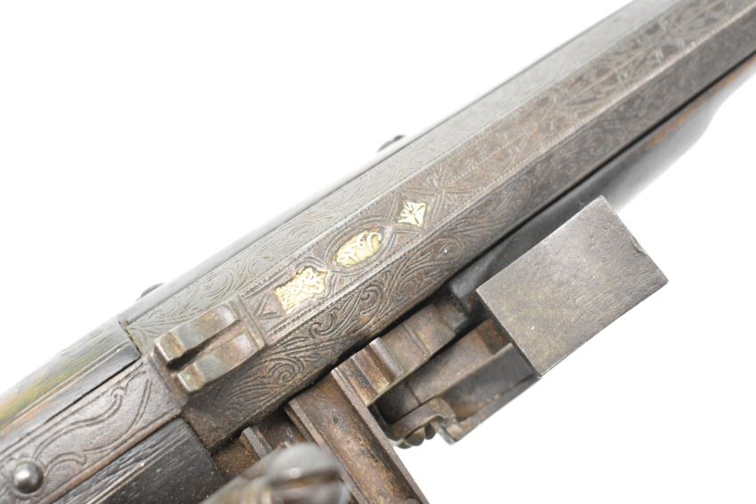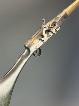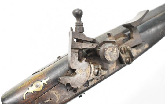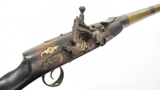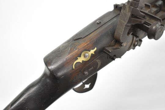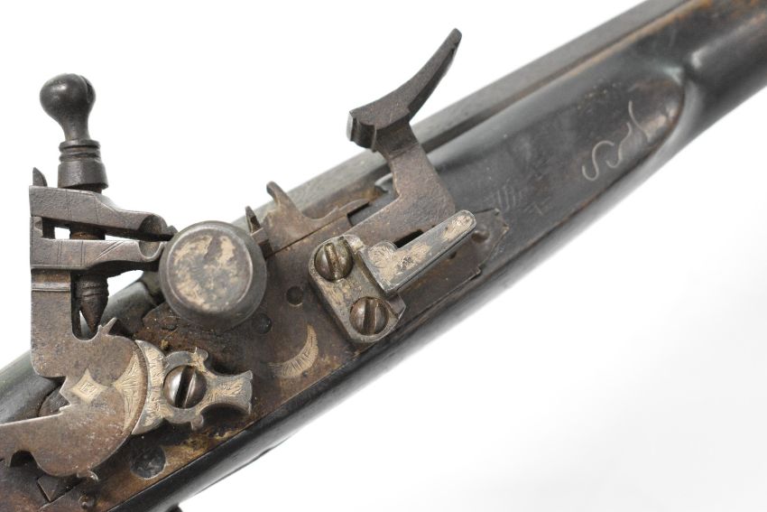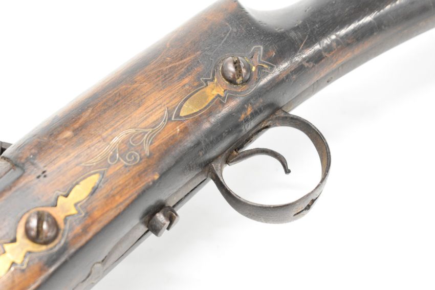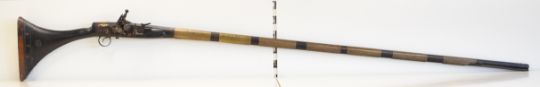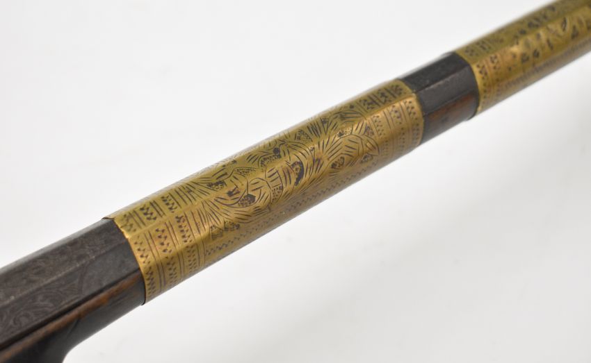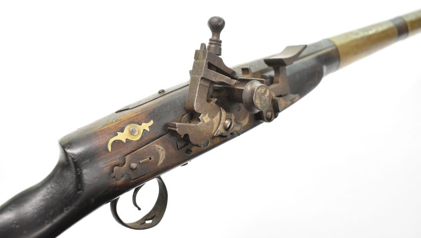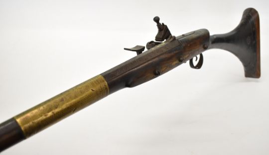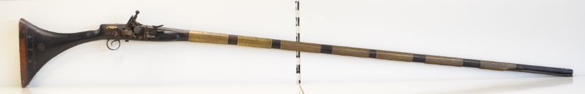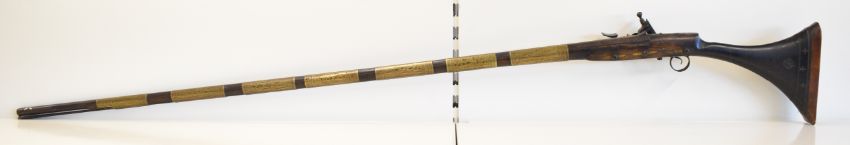 Turkish, Ottoman or Middle Eastern 28 bore flintlock gun with silver wire inlaid decoration to the stock, engraved brass barrel bands and 55 inch smooth bored barrel, overall length 177cm.