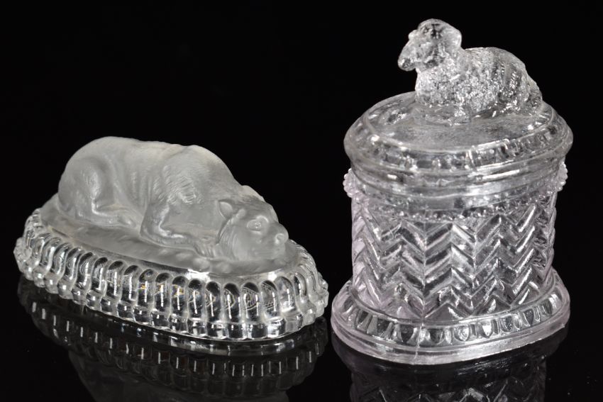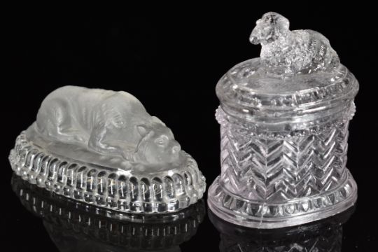 Two 18thC wine glasses with folded feet, later etched drinking glasses, Victorian covered pot with sheep finial, recumbent lion etc, tallest 15cm