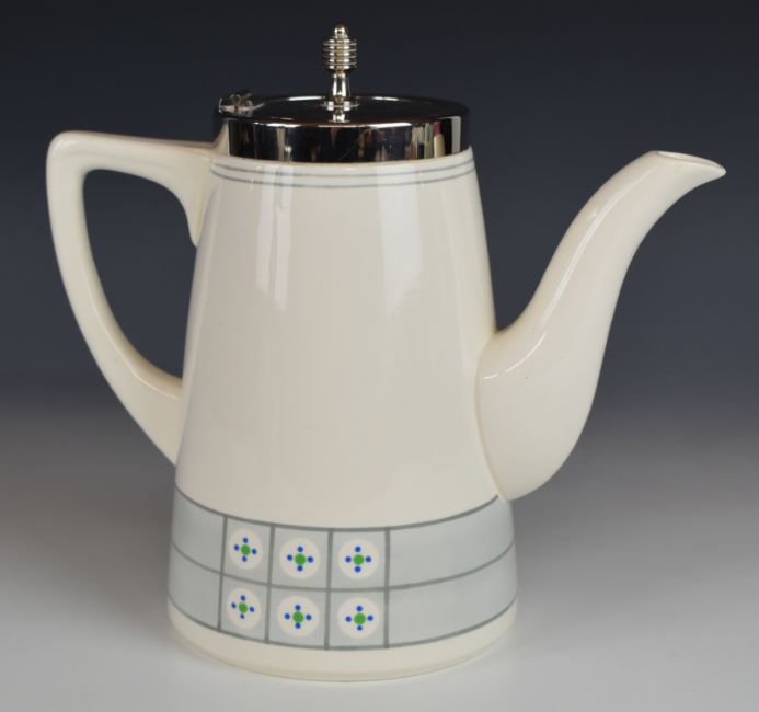 WMF secessionist / Art Deco tea set and tray with plated mounts, designed by Christian Neureuther circa 1930s, tallest 20cm