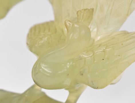 Chinese carved jadeite or similar bird group, on stand, H20cm