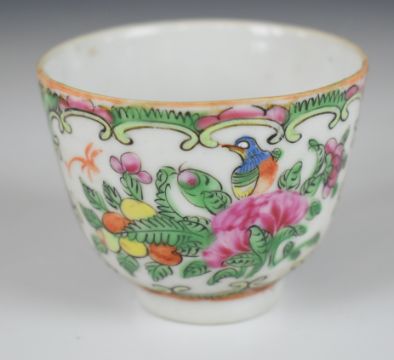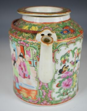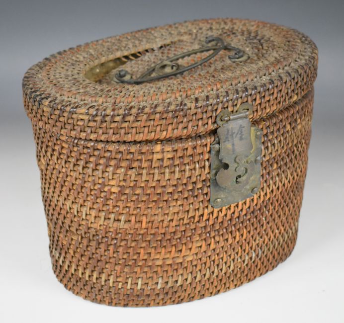 19th/20thC Chinese famille rose teapot and cup, in woven container, H30cm