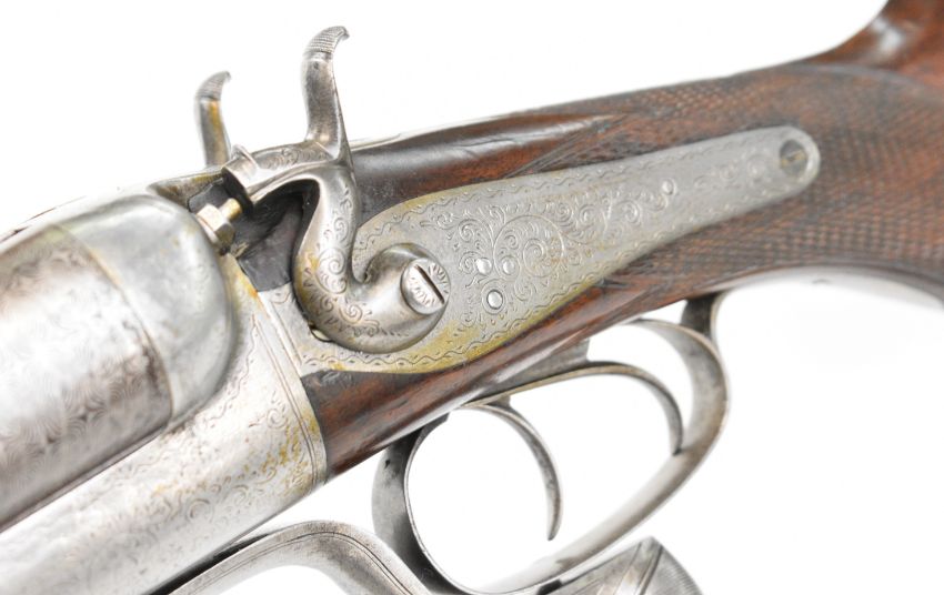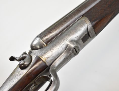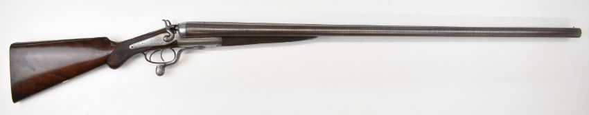 Midland Gun Co 8 bore side by side double barrelled hammer action shotgun with engraved locks, rebounding stylised dolphin hammers, rotary underlever, top strap and fences, chequered semi-pistol grip and forend, vacant cartouche to the underside of the stock, double trigger and named 36.25 inch Damascus barrels, overall length 135cm, length of pull 36.5cm, serial number 20976.