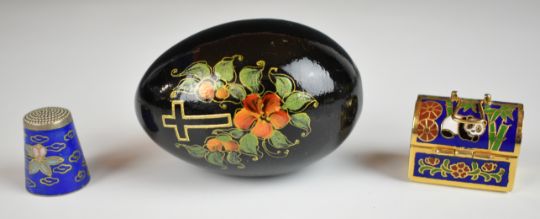 Pair of Chinese cloisonné covered vases, eggs on stands, bronze figure of a man praying, Russian lacquer items, daguerreotype silhouettes including gold highlighted, vintage Singapore advertising ruler and a set of graduated brass and copper seer measures etc