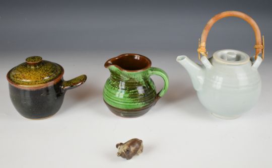 Studio pottery including Winchcombe, vase converted to lamp and bowl, Stephen Gerard teapot, Anne James lamp, West German vase and Sidney Tustin ovenware, etc, tallest 23cm