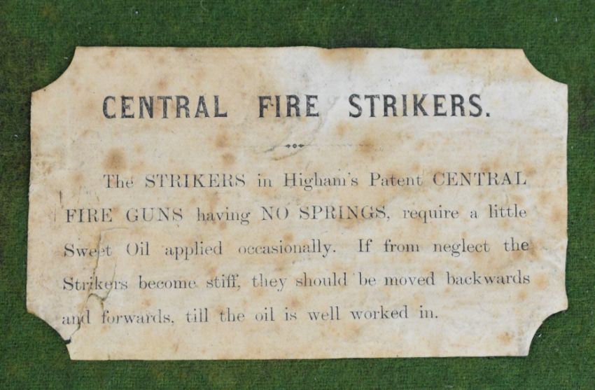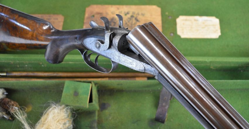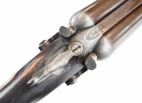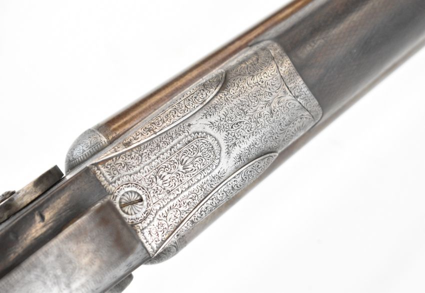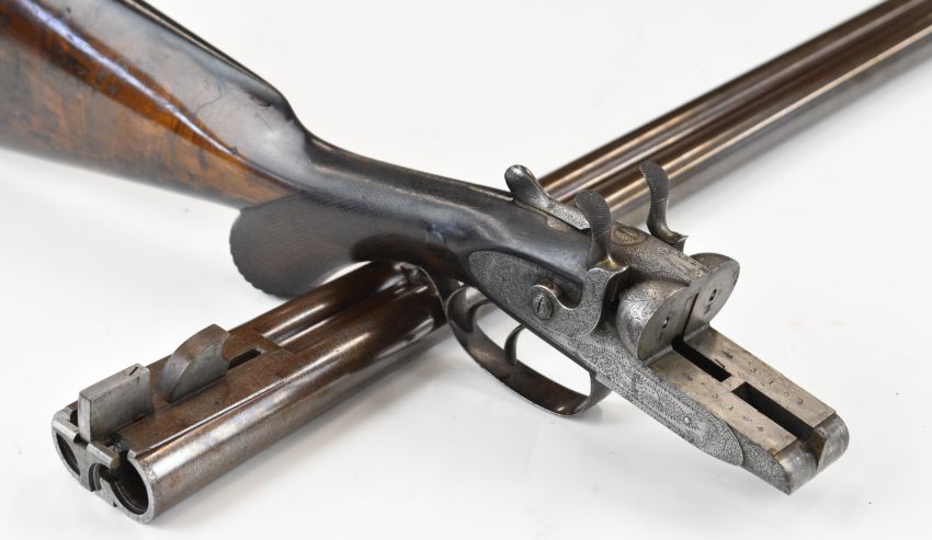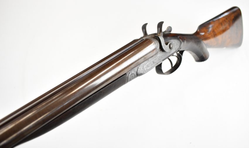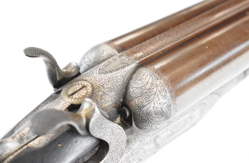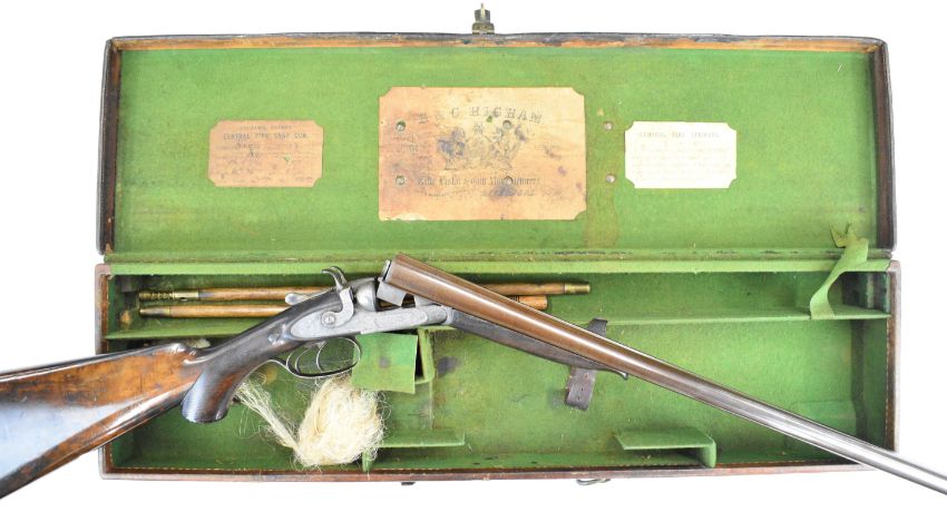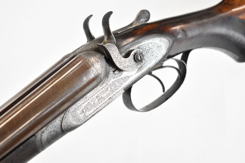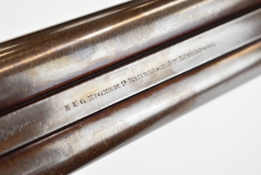 E&G Higham of Liverpool 12 bore side by side hammer action shotgun with named and engraved locks, engraved hammers, trigger guard, underside, top plate, thumb lever and fences, horn tipped chequered semi-pistol grip and forend, carved teardrop to the wrist, engraved cartouche to the underside of the stock, double trigger and named 30 inch Damascus barrels choked improved cylinder, overall length 119cm, length of pull 36.5cm, serial number 3164, in original leather bound case with fitted interior 'E & G Higham Rifle, Pistol & Gun Manufacturer 9 Ranelash Street Liverpool', 'Higham's Patent Central Fire Snap Gun' and 'Central Fire Strikers' labels and brass plaque engraved for the original owner 'T Teer Whitehaven'PLEASE NOTE THAT A VALID RELEVANT SHOTGUN CERTIFICATE IS REQUIRED TO VIEW OR PURCHASE THIS LOT AND FOR ALL SHOTGUNS OR RIFLES. PLEASE ENSURE YOU HAVE THE RELEVANT CERTIFICATE BEFORE BIDDING.