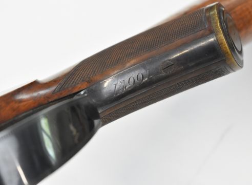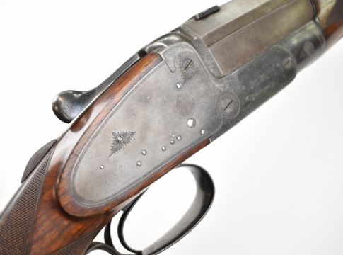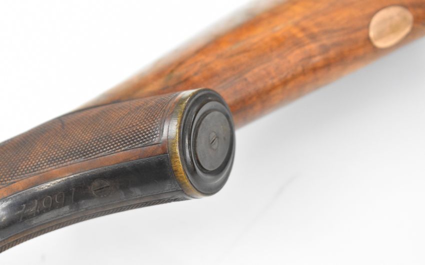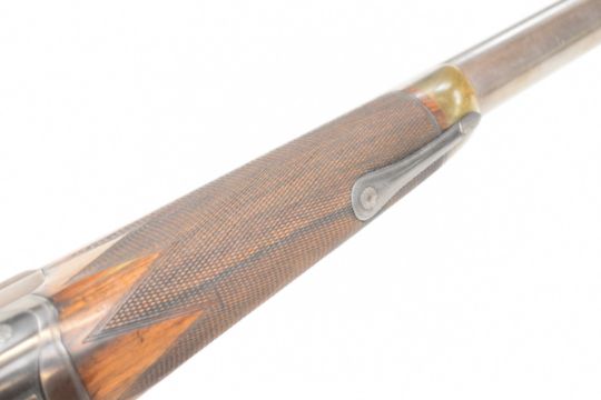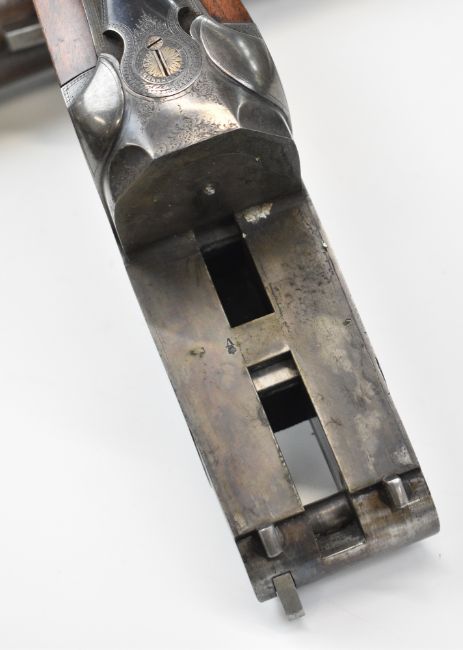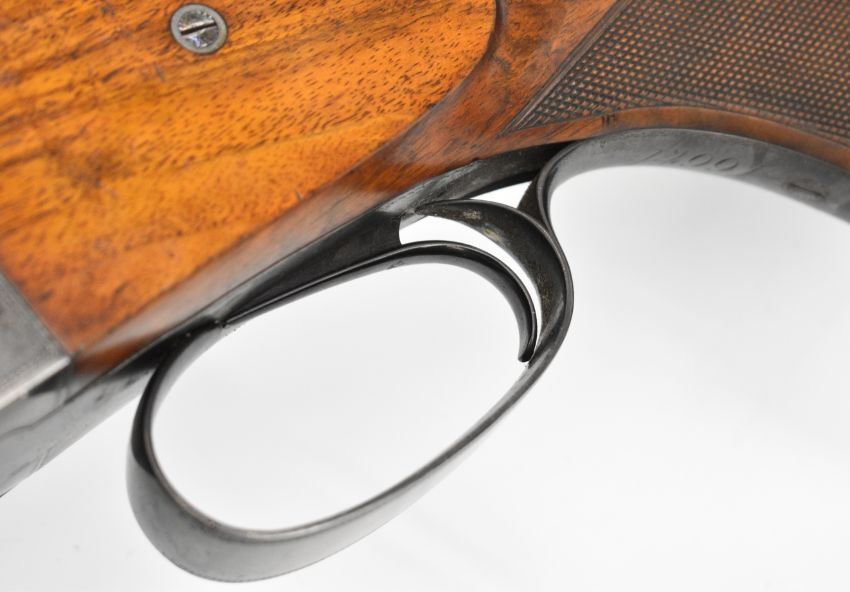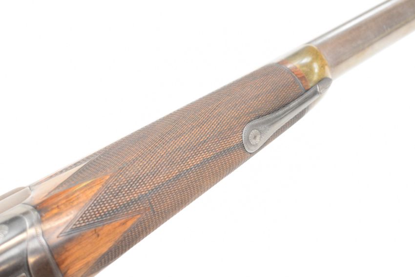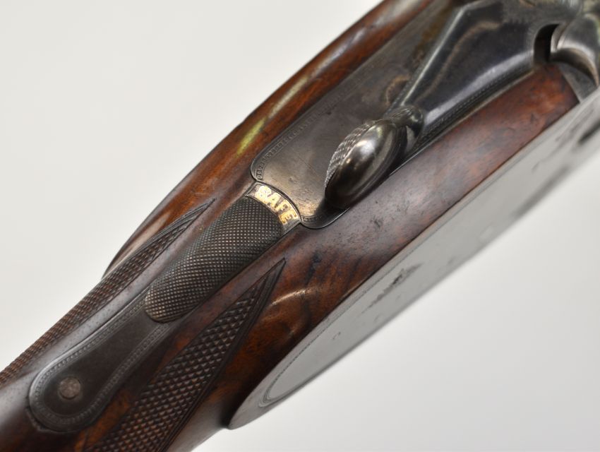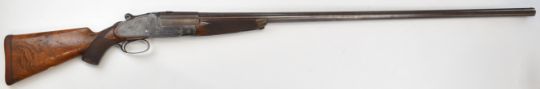 Holland & Holland 4 bore hammerless wildfowling shotgun with named action, border engraved sidelock plate, underside, top plate and thumb lever, chequered semi-pistol grip and horn tipped forend, vacant gold cartouche to the underside of the stock, folding leaf sights and 47 inch Damascus barrel engraved 'Holland & Holland 98 New Bond St London Winner of all the Field Rifle Trials', overall length 166.5cm, length of pull 36cm, serial number 14991.