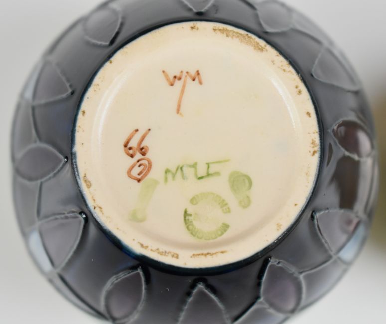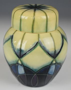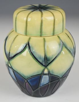 Moorcroft covered ginger jar decorated in the Indigo pattern, probably Emma Bossons, dated 99 to base, with box H10cm