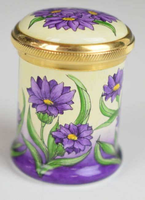 Moorcroft enamels cylindrical box with screw top, H4cm, boxed