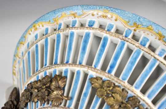 Pair of reticulated porcelain wall brackets with figural ormolu / brass or similar figural decoration, W32 x H29cm