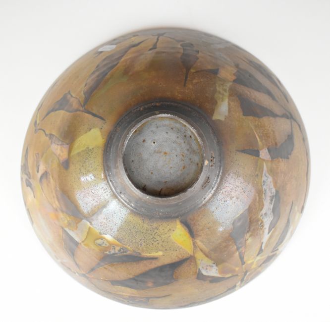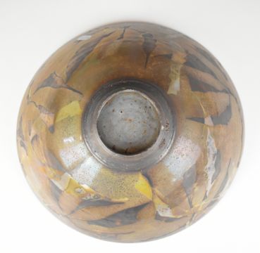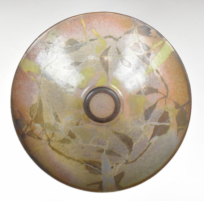 Sutton Taylor (b1943) large studio pottery pedestal bowl with mottled green and brown decoration, the exterior with a lustre glaze, diameter 34 x height 14cm