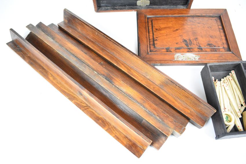 Early 20thC brass bound bone and bamboo Mah Jong set with slide out front, five drawers, twin handles and four stands, W24 x D15 x H17cm