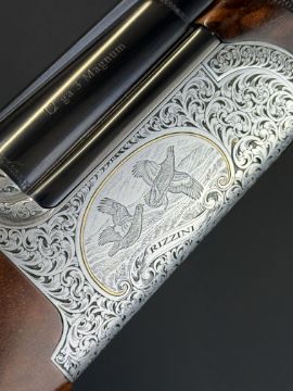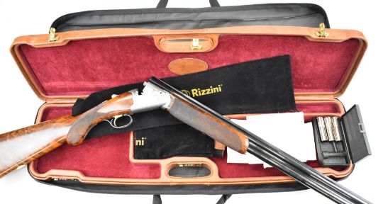 Rizzini Round Body EL 12 bore over and under ejector shotgun with engraved scenes of birds surrounded by gold inlay to the action, scrolling engraving to the action, trigger guard, top plate and thumb lever, chequered semi-pistol grip and forend, vacant cartouche to the underside of the stock, single trigger and 28 inch multi-choke barrels, overall length 116cm, length of pull 37.5cm, serial number 89283, in original fitted leather case with three additional chokes, choke key, dust covers and case cover. PLEASE NOTE THAT A VALID RELEVANT SHOTGUN CERTIFICATE IS REQUIRED TO VIEW OR PURCHASE THIS LOT AND FOR ALL SHOTGUNS OR RIFLES. PLEASE ENSURE YOU HAVE THE RELEVANT CERTIFICATE BEFORE BIDDING.