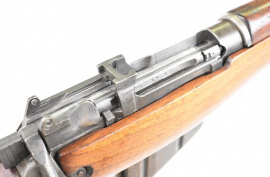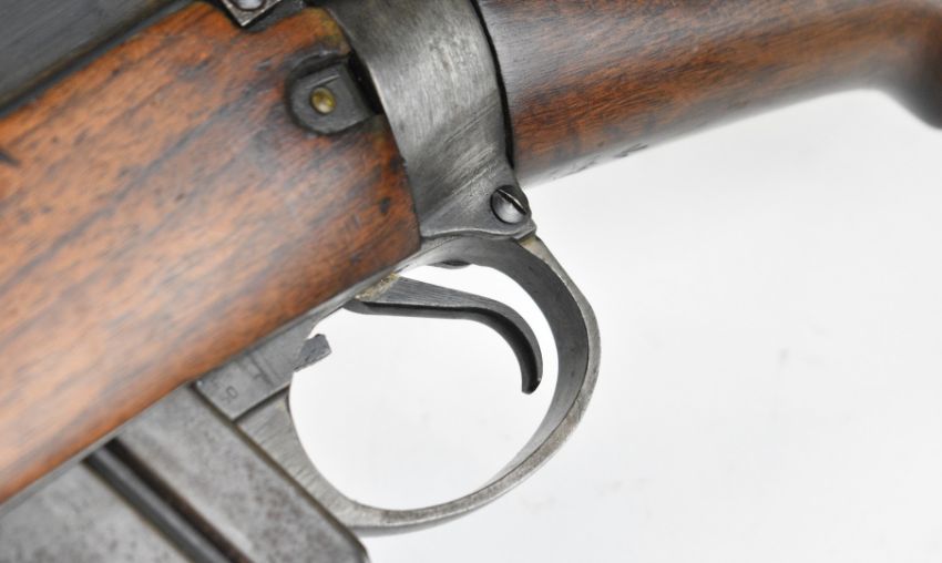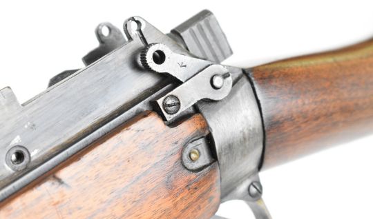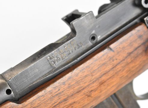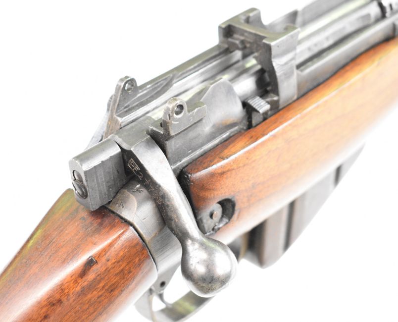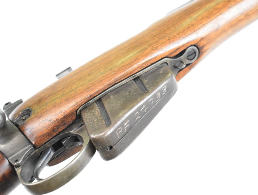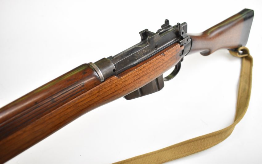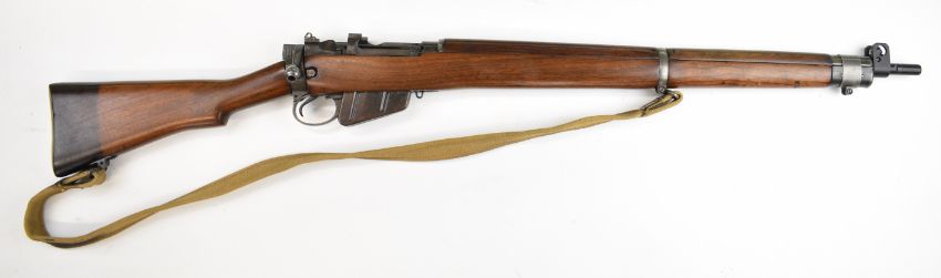Short Magazine Lee Enfield (SMLE) No 4 Mk 1/2 .303 bolt-action service rifle with framed stamped 'No 4 Mk 1/2 (F) 0/49 PF 27733', storage compartment to the brass butt plate, canvas sling, multi-shot magazine and 25 inch barrel, overall length 112cm, serial number 27733. PLEASE NOTE THAT A VALID RELEVANT FIRARMS CERTIFICATE IS REQUIRED TO VIEW OR PURCHASE THIS LOT AND FOR ALL SHOTGUNS OR RIFLES PLEASE ENSURE YOU HAVE THE RELEVANT CERTIFICATE BEFORE BIDDING.