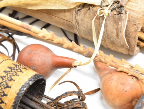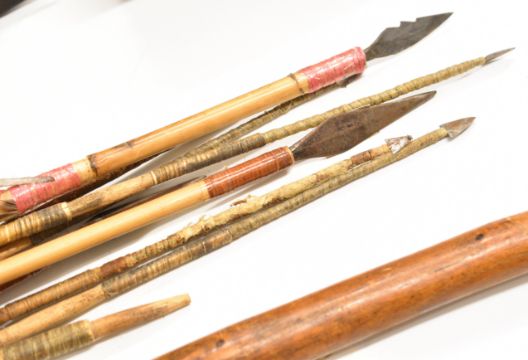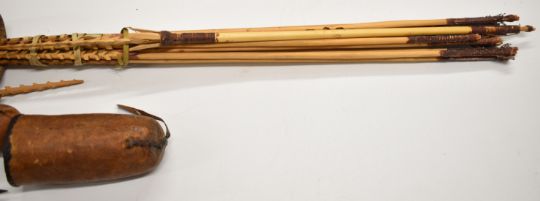 Three 19thC and later tribal quivers and three bows including African, fish arrows, tooled leather etc, longest quiver 61cm, bow 134cm