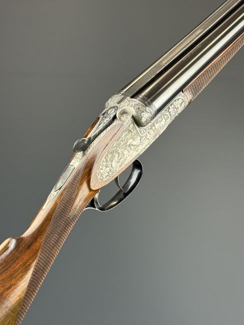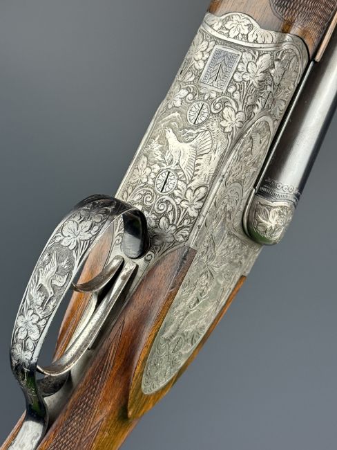 Simon Kalischnig of Ferlach Austria 12 bore side by side sidelock ejector shotgun with heavily engraved scenes of birds and rabbits to the locks, underside and trigger guard, engraved top strap, butt plates, thumb lever and fences, chequered grip and forend, double trigger and named 28.25 inch barrels choked full and ¾ and engraved 'Special Seahl' overall length 114.5cm, length of pull 37.5cm, serial number 38250, with military tags stating 'This gun has not been used'. PLEASE NOTE THAT A VALID RELEVANT SHOTGUN CERTIFICATE IS REQUIRED TO VIEW OR PURCHASE THIS LOT AND FOR ALL SHOTGUNS OR RIFLES PLEASE ENSURE YOU HAVE THE RELEVANT CERTIFICATE BEFORE BIDDING.