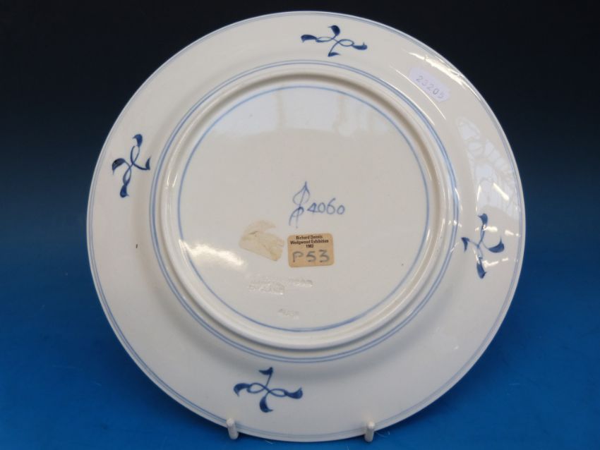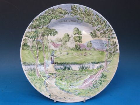 A set of three Alfred Powell for Wedgwood Arts & Crafts plates hand decorated with Welsh scenes; Lynn Ogwen, Pontypair and Valle Crucis. Impressed Wedgwood mark, Alfred Powell monogram and 4060 as well as a Richard Dennis Wedgwood Exhibition sticker 1982 with 'P53' in pen (see photograph)